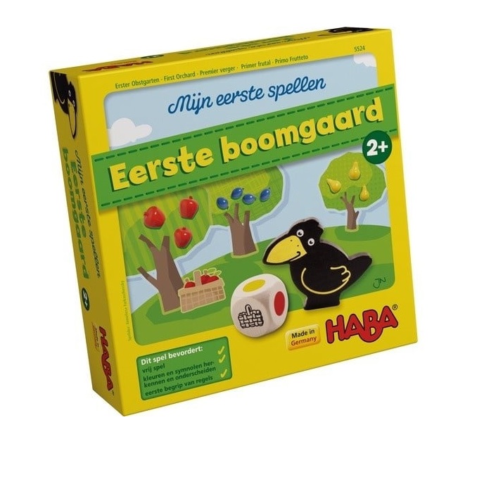 In Haba Mijn Eerste Spellen Eerste Boomgaard wil de raaf wil de rijpe vruchten pikken! Maar de kinderen werken samen en verzamelen zoveel kersen, pruimen, peren en appels als ze kunnen. De spanning stijgt. Wie zal er winnen: de stoute raaf of de vlijtige