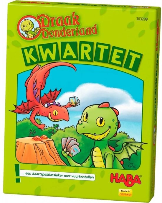 Draak Dondertand Kwartet van het Duitse merk Haba is een kaart spel. Draak Dondertand en zijn vrienden spelen vandaag kwartet! Wie mag meespelen? Met wat concentratie en de juiste portie geluk kun je vier dezelfde kaarten verzamelen en zo een kwartet vormen. Als beloning krijg je dan een vuurkristal. Wie slaagt erin om de meeste vuurkristallen te verzamelen?