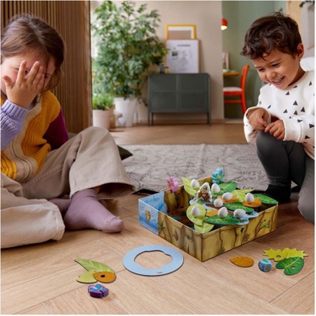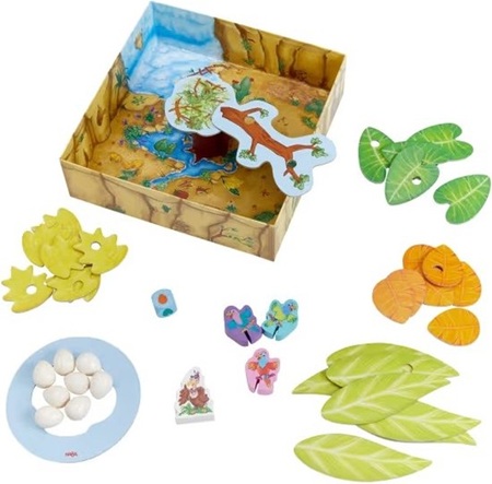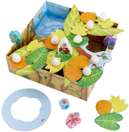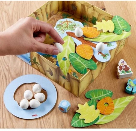 Mevrouw de Gier heeft zoveel eieren gelegd, dat ze helemaal niet meer in haar nest passen! Helpen jullie haar mee een groter nest te bouwen? In dit leuke coöperatieve familiespel van HABA gaan jullie samen aan de slag om bladeren te plaatsen. Jullie proberen boven de doos de bladeren zo op elkaar te stapelen dat er genoeg ruimte is voor alle eieren van mevrouw Gier. Maar pas op! Want de brutale papegaaien eisen ook ruimte op voor hun nestjes. Lukt het jullie om het nest uit te breiden voor mevrouw Gier, dan winnen jullie samen het spel. Mevrouw Gier! is een supergrappig en mooi vormgegeven spel voor kinderen vanaf 3 jaar, maar wat je met het hele gezin kunt spelen. Het fysieke aspect bevordert bovendien spelenderwijs de fijne motoriek, en de rest van het spel leert samenwerking en sociale vaardigheden. Een perfect cadeau voor spelletjesfanaten met stalen zenuwen!