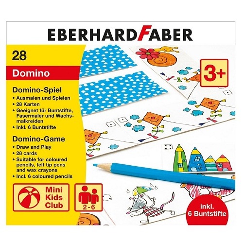 Het dominospel van Eberhard Faber biedt creatief speelplezier – eerst kleuren, dan spelen! De set bestaat uit 28 kaarten en 6 kleurpotloden. De kaarten kunnen naar hartenlust worden versierd met kleurpotloden, stiften of krijtjes. Deze dominoset met afbeeldingen volgt de klassieke regels. Naast leuke, kindvriendelijke afbeeldingen, staan er ook cijfers op de kaarten. Jonge dominospelers leren spelenderwijs de verschillende afbeeldingen te onderscheiden en correct te combineren, terwijl ze tegelijkertijd vertrouwd raken met cijfers. Dankzij het handzame formaat van circa 4 x 14 x 13,5 cm is het spel ideaal voor op reis.