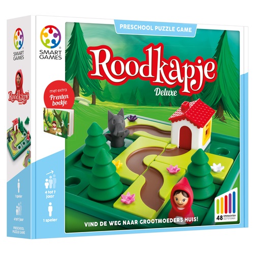 Vind de weg naar grootmoeder’s huis. Er was eens… Ontdek de magie van het populaire sprookje in dit originele denkspel speciaal voor de allerkleinsten. Kan jij Roodkapje helpen om de weg naar Grootmoeder’s huis te vinden? Zet Roodkapje, grootmoeder’s huis en de bomen op hetspelbord en gebruik de puzzelstukken om een weg van Roodkapje naar het huis te maken. Kan je alle 24 opdrachten oplossen? Je kan het spel ook spelen met de wolf erbij, maar let op want hij zal eerst bij het huis zijn! Probeer deze 24 andere opdrachten op te lossen door twee wegen naar het huis te maken, één voor Roodkapje en één voor de wolf. Roodkapje bestaat uit 48 opdrachten (24 met de wolf en 24 zonder) en bevat ook een leuk prentenboekje met het originele sprookje in een eigentijds jasje.