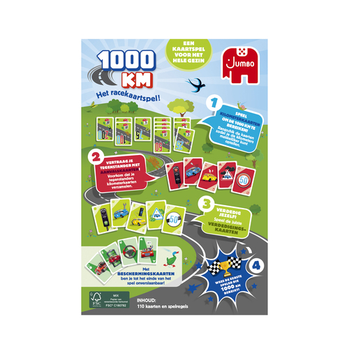 Een leuke variant op het 1000KM bordspel, namelijk het kaartspel 1000KM! Lukt het jou om als eerste je elektrische auto over de finish te brengen? Dus op je strepen, zet je schrap, ga! Speel je kilometerkaarten en race 1000 kilometer naar de finish met je auto. Gebruik aanvalskaarten zoals “Stroomstoring” of “luchtvervuiling” om je teamgenoten te stoppen. Of verdedigingskaarten zoals “snelladen” en “carpoolen” om jezelf te verdedigen tegen aanvallen. Wie als eerste over de finish komt, wint deze milieuvriendelijke race.