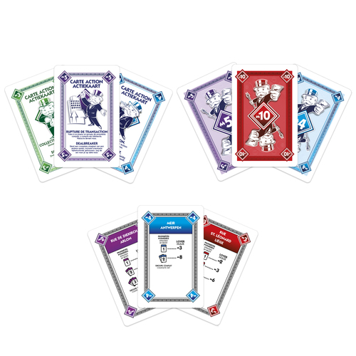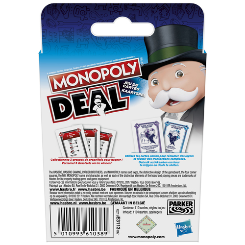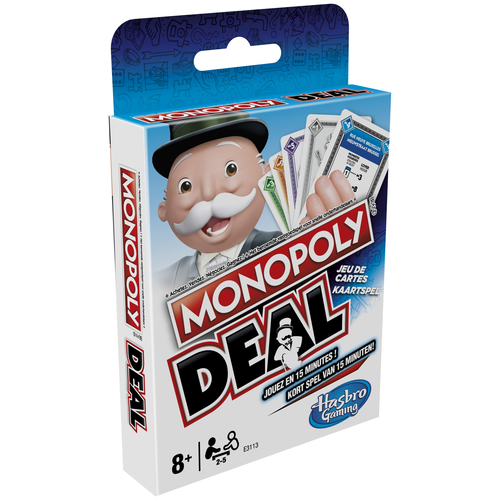 Het Monopoly Deal-kaartspel bevat al het speelplezier van de klassieke Monopoly met rondes die niet lang duren. De set bevat 110 kaarten waaronder eigendomskaarten, huurkaarten, huis- en hotelkaarten en jokereigendomskaarten. Met actiekaarten kunnen spelers bijvoorbeeld huurgeld vragen en gewaagde deals sluiten. Huis- en hotelkaarten drijven de huurwaarde op. Met jokereigendomskaarten kunnen spelers eigendomssets samenstellen. Schulden worden betaald met geldkaarten. Om te winnen moet je als eerste 3 volledige sets eigendomskaarten van verschillende kleuren verzamelen. Dit kaartspel is ideaal om het vastgoedspel voor snelle onderhandelaars in amper 15 minuten te spelen! De namen en logo’s van Hasbro Gaming, Parker Brothers en Monopoly, het kenmerkende ontwerp van het spelbord, de vier hoekvakjes, de naam Mr. Monopoly en het figuurtje, evenals elk van de kenmerkende elementen van het bord en de pionnen zijn handelsmerken van Hasbro voor haar beroemde gezelschapsspel en toebehoren.