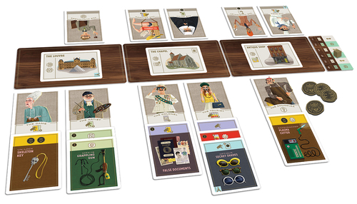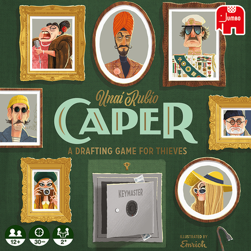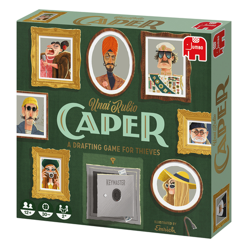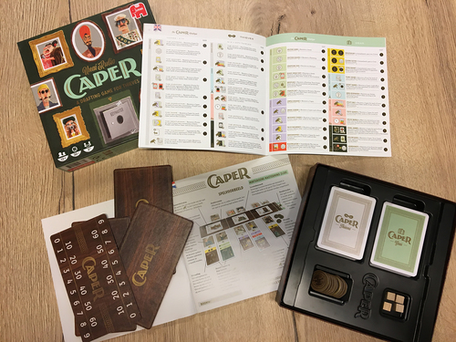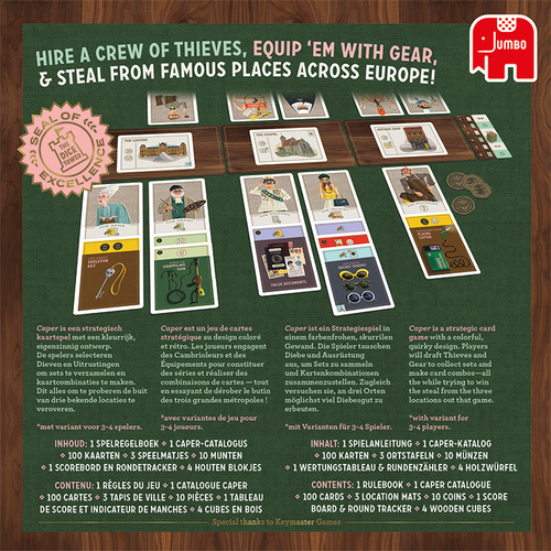 Werf een eigenzinnig team van Dieven en rust ze uit met kleurrijke Uitrustingskaarten om op rooftocht te gaan in verschillende bekende Europese steden! Bewijs met Caper dat jij de beste dievenbende leidt. In Caper vormen de spelers een team van Dieven door het spelen van Dievenkaarten en Uitrustingskaarten. Het spel omvat 6 rondes waarbij in de oneven rondes Dievenkaarten en in de even rondes Uitrustingskaarten worden gespeeld. Tijdens een Dievenronde plaatsen de spelers verschillende Dieven op de Locaties. Tijdens een Uitrustingsronde leggen spelers Uitrustingskaarten op hun Dieven om hun invloed op een bepaalde Locatie te vergroten. Na het spelen van een kaart wisselen de spelers van hand dus denk er nog even goed over na of je je tegenspeler die ene kaart wel gunt. Het team van Dieven met de meeste Capers op een Locatie ontvangt de Beloning die bij die Locatie hoort. Sommige Dieven- en Uitrustingskaarten bevatten speciale Vaardigheden die de spelers kunnen helpen om extra Punten te verdienen. Spelers kunnen ook verschillende soorten Gestolen Goederen verzamelen die aan het einde van het spel punten opleveren. Uiteindelijk zal de speler van het team van Dieven met de meeste Punten de winnaar zijn. ONDERDELEN 3 Dubbelzijdige locatiematjes 1 Caper-Catalogus 1 Scorebord & Rondetracker 23 Locatiekaarten 24 Dievenkaarten 48 Uitrustingskaarten 5 Referentiekaarten 4 Houten blokjes 10 Munten