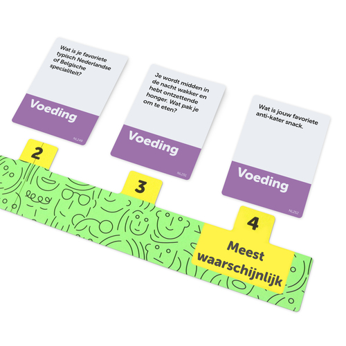 De andere spelers kiezen een van de 5 kaarten en beantwoorden die… Maar welke was het nu? De radende speler rangschikt de vijf kaarten van ‘minst waarschijnlijk’ naar ‘meest waarschijnlijk’ op het spelbord.
