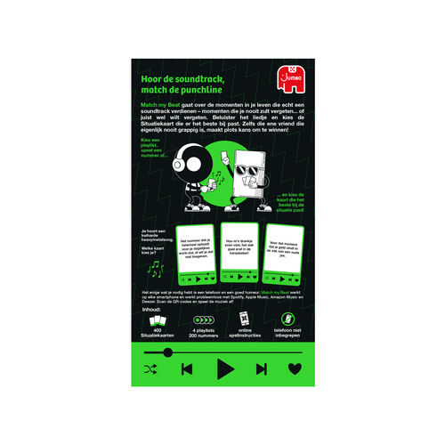Maak van je volgende spelletjesavond een chaotische, hilarische ervaring met Match My Beat – het ultieme partyspel voor volwassenen dat muziek, creativiteit en belachelijke discussies combineert. Dit is niet je typische muziekquiz. Geen artiestennamen, releasedata of obscure songfeitjes nodig – alleen een goed gevoel voor humor en een licht ontspoorde fantasie.Met 400 scenariokaarten en 200 nummers verdeeld over vier thematische afspeellijsten is geen enkele ronde hetzelfde. Elke beurt koppelen spelers liedjes aan scenario’s: het ene moment kies je het perfecte anthem voor een dramatische break‑up, het volgende moment discussieer je over de beste soundtrack voor een pijnlijk ongemakkelijk moment.Alles wat je nodig hebt is een telefoon en je favoriete muziekstreamingapp (Spotify, Amazon Music, Apple Music of Deezer). Deel de scenario’s uit, scan de QR‑code van de playlist en laat de chaos beginnen – het perfecte cadeau voor elke muziekliefhebber.Snel op te zetten en makkelijk te leren, dit spel is altijd een hit bij: Spelletjesavonden met vrienden, Familiefeestjes, vieringen en speciale gelegenheden, Icebreakers en groepsactiviteiten.Ben je op zoek naar iets anders dan het standaard bordspel, dan wordt Match My Beat jouw nieuwe favoriet voor elke spelletjesavond.
