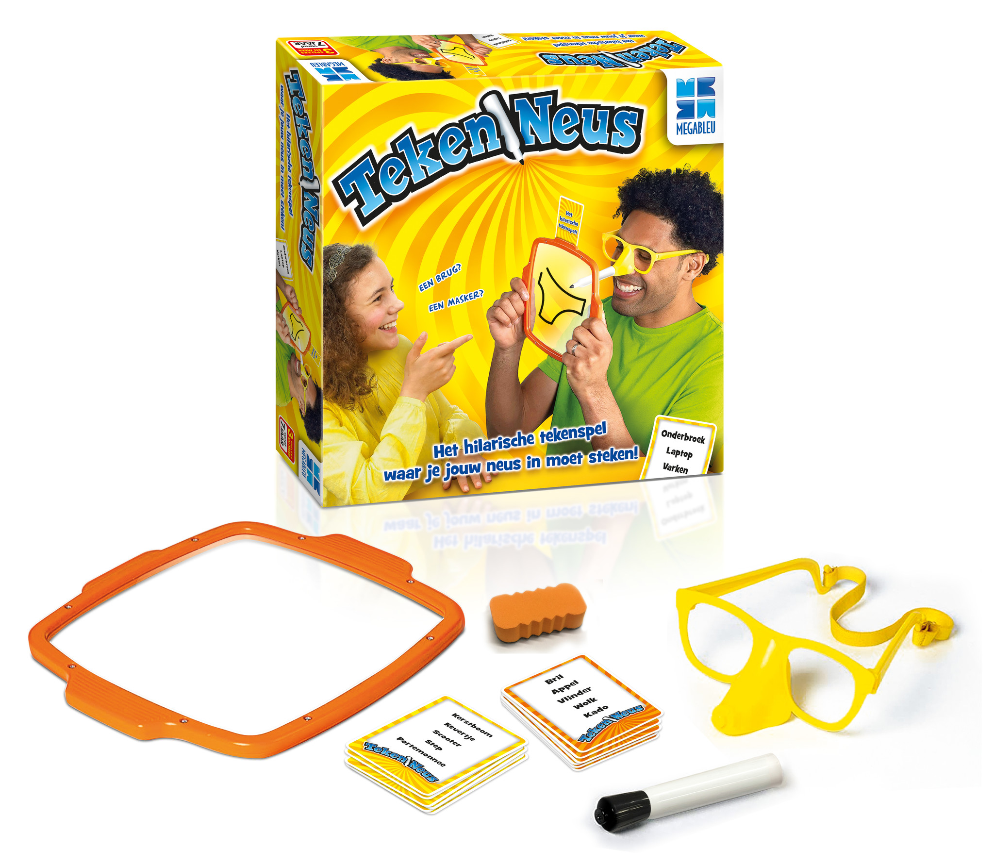 Trek een kaart en teken uit de vrije… Neus?!   Zet de gekke bril met stifthouder op, trek een kaart en zet de kaart bovenop het tekenbord. Teken ieder woord van het lijstje en laat de andere spelers ze één voor één raden. Het lijkt misschien gemakkel