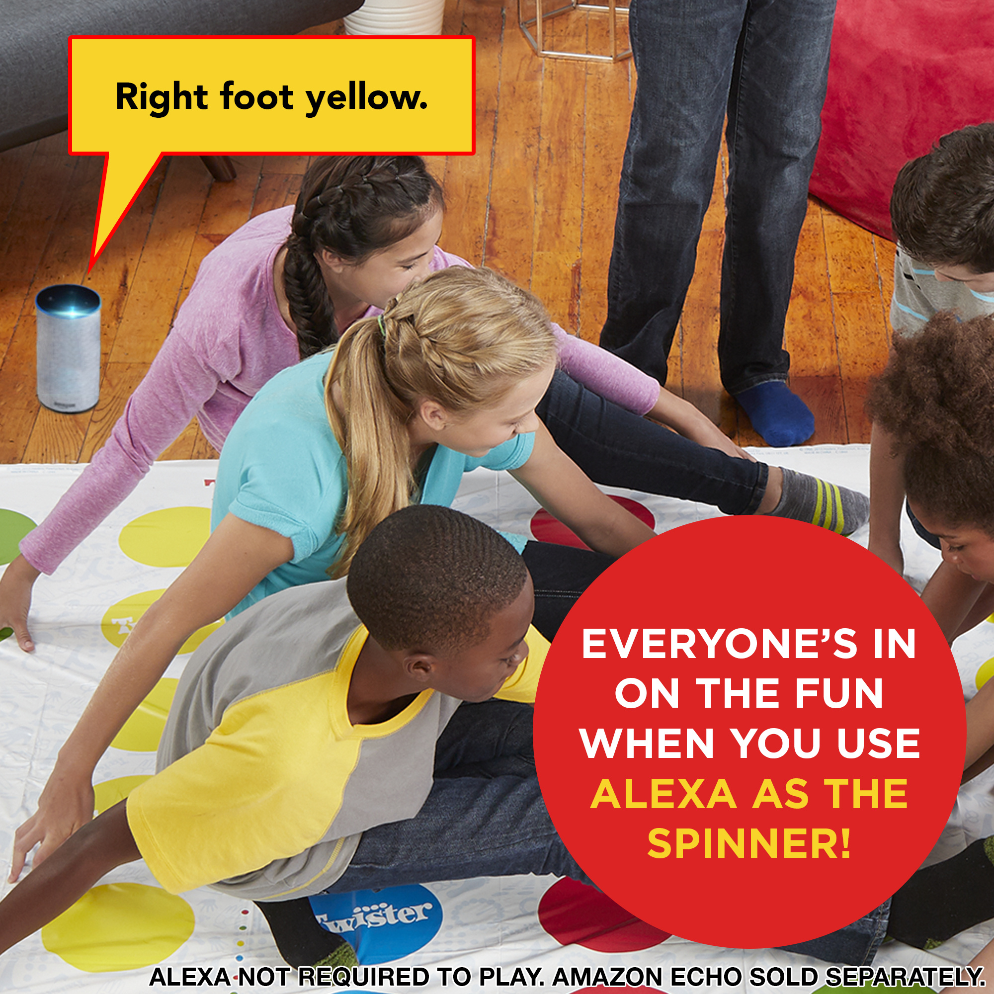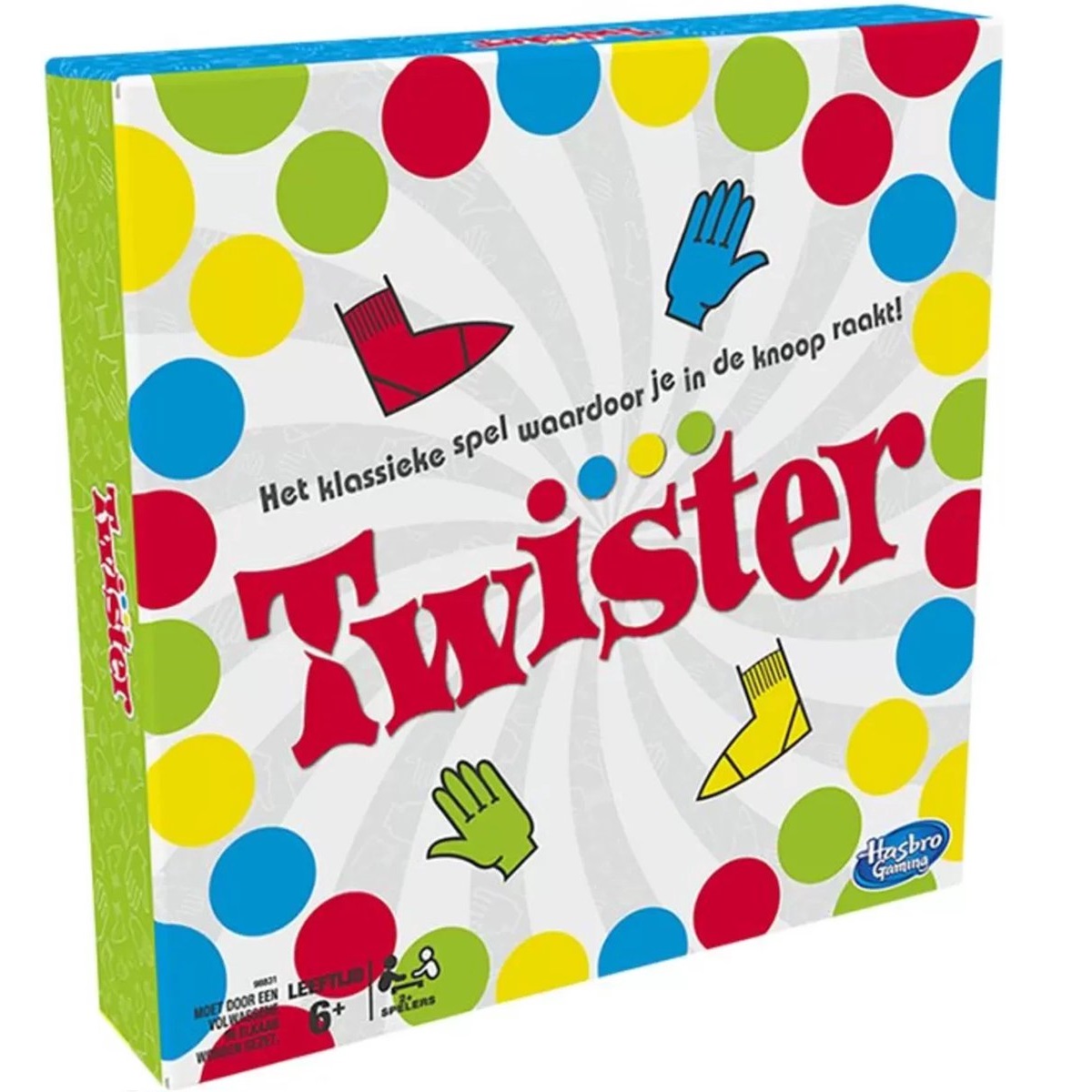 Voeg plezier toe aan een feestje of familieavond met dit klassieke spel dat spelers in de knoop legt! Eén persoon geeft een draai aan de draaiwijzer — en zie wat er gebeurt wanneer de spelers hun handen en voeten op de mat proberen te houden! Rechterv