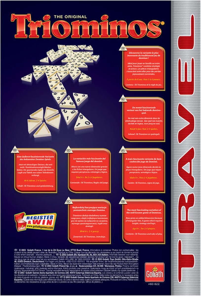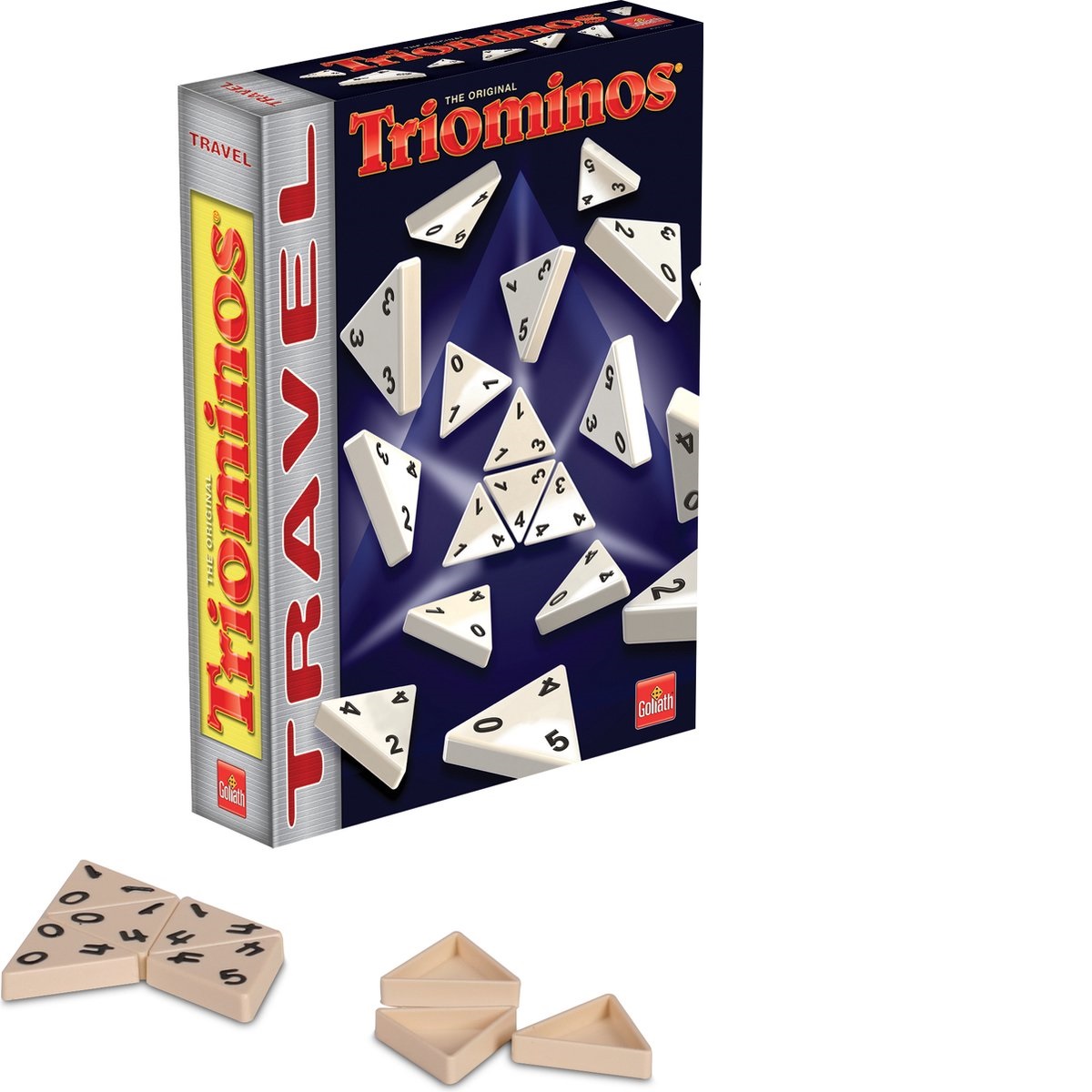 Het originele Triominos spel, nu voor onderweg! Een tactisch spel met driehoekige, genummerde stenen. Zoek je kansen, leg ze snel aan en scoor zo veel mogelijk punten. Bij dit spel gaat het niet alleen om inzicht maar ook om tactisch spelen: sommige aangelegde figuren leveren je namelijk ook veel punten op! Het spel begint door een willekeurige steen op tafel te leggen en de speler scoort ook de waarde van deze steen. Iedere speler probeert tijdens zijn beurt een van zijn Triominos stenen passend aan te leggen aan alle kanten van alle stenen die reeds op tafel liggen. Het spel eindigt wanneer een speler al zijn stenen van zijn plankje heeft gespeeld. De winnaar is uiteindelijk degene met de meeste punten.