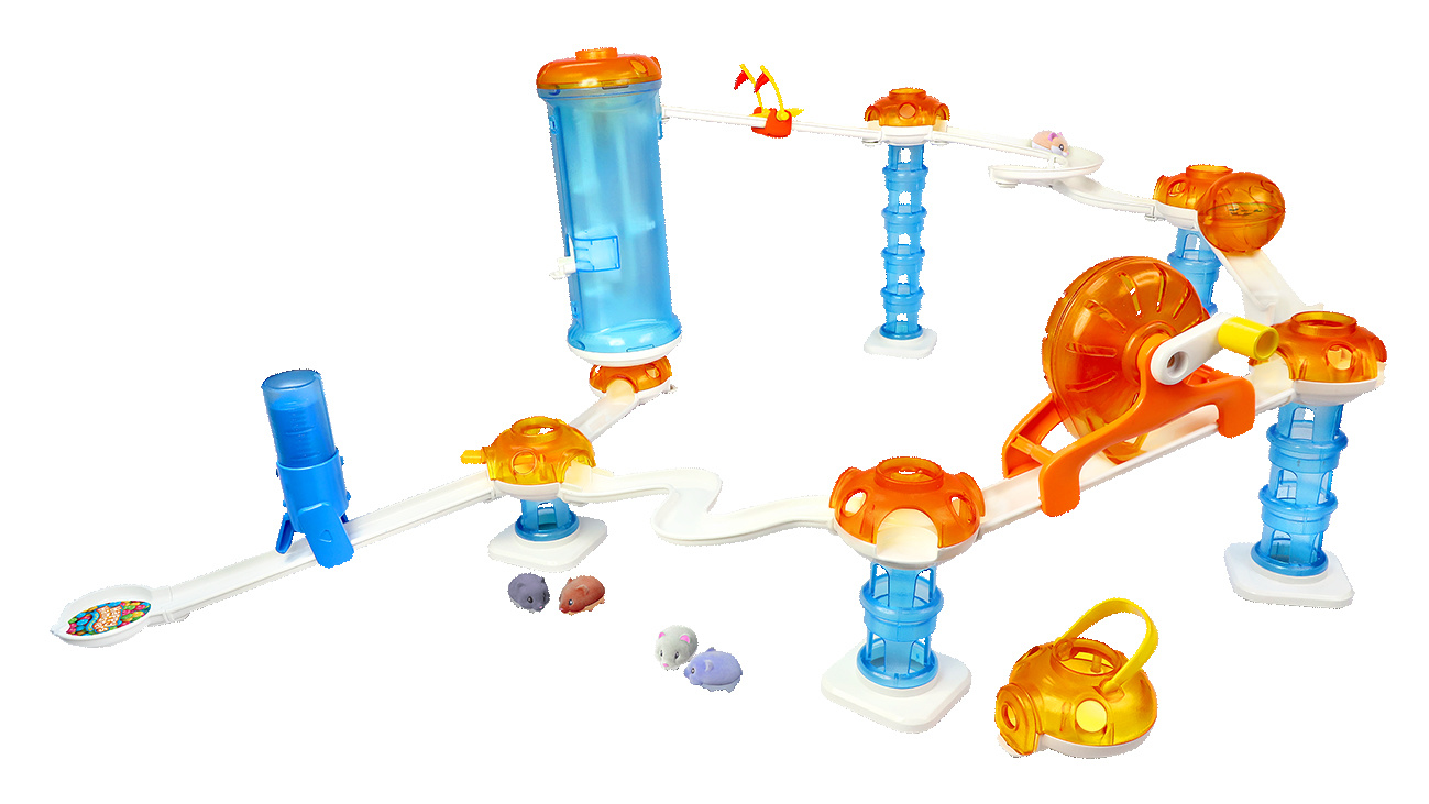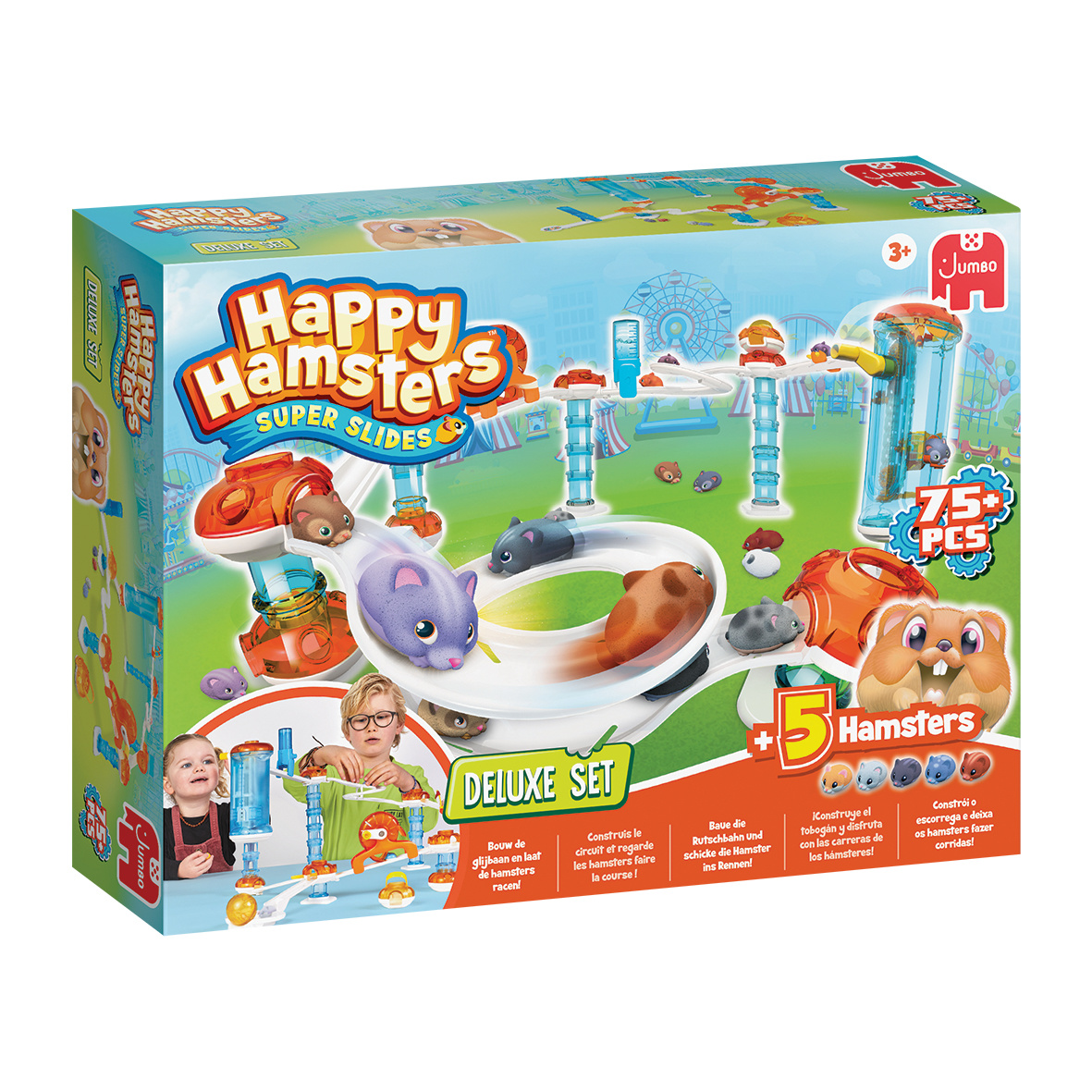 Ontdek de razendsnelle wereld van de Happy Hamsters! Met Happy Hamsters Deluxe Set van Jumbo bouw je een racebaan voor hamsters. Bouw een super knikkerbaan met deze speelset en kijk hoe de schattige hamsters naar beneden glijden! Dit vrolijke construct