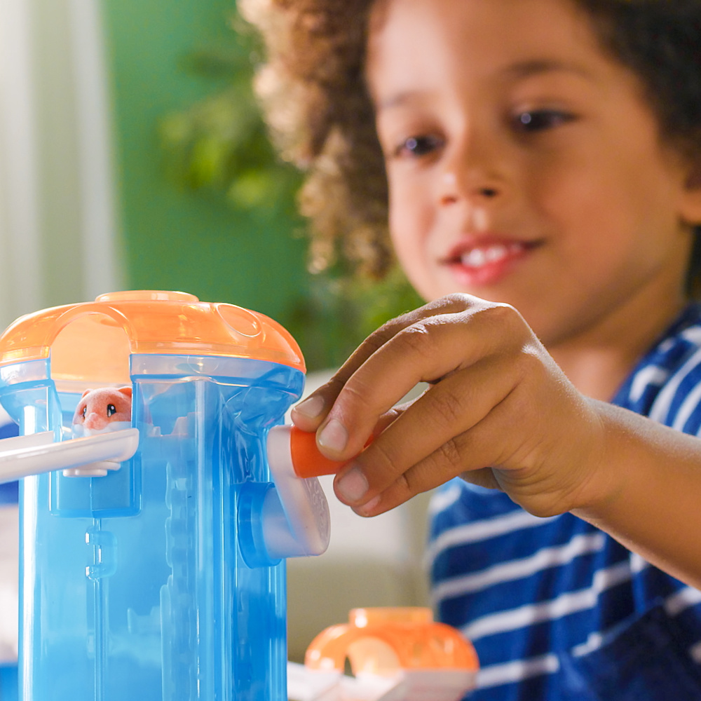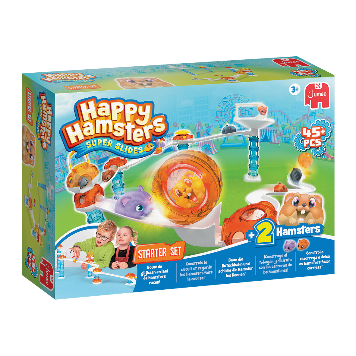 Ontdek de razendsnelle wereld van de Happy Hamsters! Met Happy Hamsters Starter Set van Jumbo bouw je een racebaan voor hamsters. Bouw een super knikkerbaan met deze speelset en kijk hoe de schattige hamsters naar beneden glijden! Dit vrolijke construc