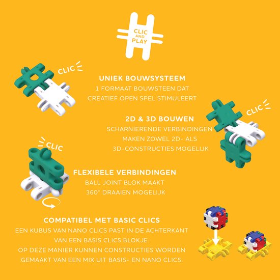 EDUCATIEF SPEELGOED – het plug-in spel van Nano Clics bevordert de creativiteit en motoriek van je kind. Met Nano Clics introduceren we ook een nieuw blokje met een gaatje in het midden. Hiermee kan je nog gedetailleerder bouwen dan ooit tevoren!