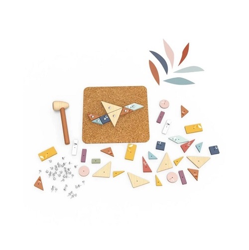 Deze set bevat een stevig kurken paneel, een ergonomisch ontworpen houten hamer op maat voor kleine handjes en flashcards met modellen om na te maken. De combinatie van gereedschap en visuele aanwijzingen stimuleert creativiteit en ontwikkelt tegelijkertijd essentiële ontwikkelingsvaardigheden.