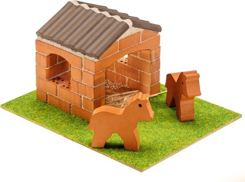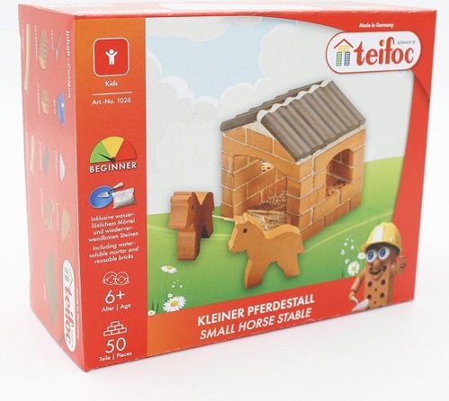Deze set bevat 50 onderdelen waarmee kinderen vanaf 6 jaar een charmante minipaardenstal met twee kleine kleipaardjes kunnen bouwen. De natuurlijke, wateroplosbare mortel maakt het mogelijk om de stal steeds opnieuw af te breken en op te bouwen – duurzaam en creatief speelplezier.