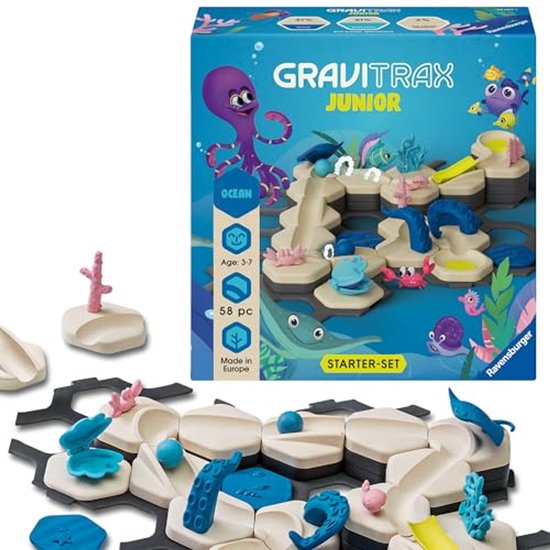 Duik in een wereld van avontuur met de GraviTrax Junior Starter Set S – Ocean! Bouw een betoverend kogelbaanparcours met een onderwater thema en ontdek hoe zwaartekracht, magnetisme en kinetica samenwerken om de kog