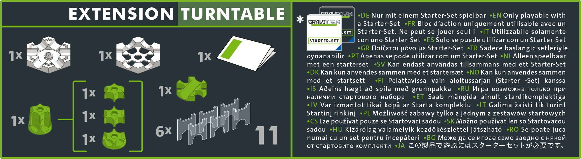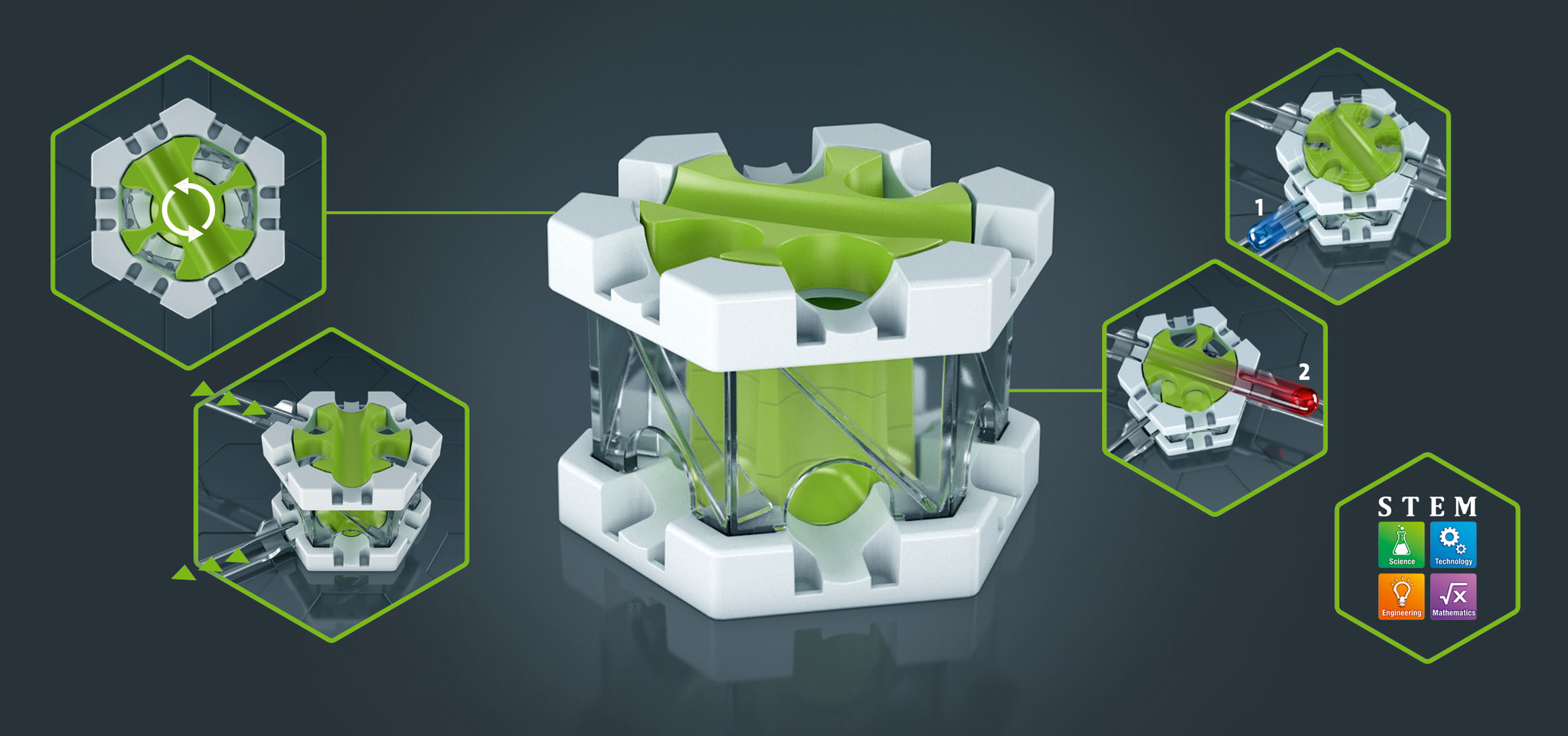 Laat je knikkers dit innovatieve blok binnenstormen dat bij elke beweging om zichzelf draait! Dit actieblok wordt gespeeld met minimaal één Starter Set en kan vervolgens worden gecombineerd met alle GraviTrax-elementen.