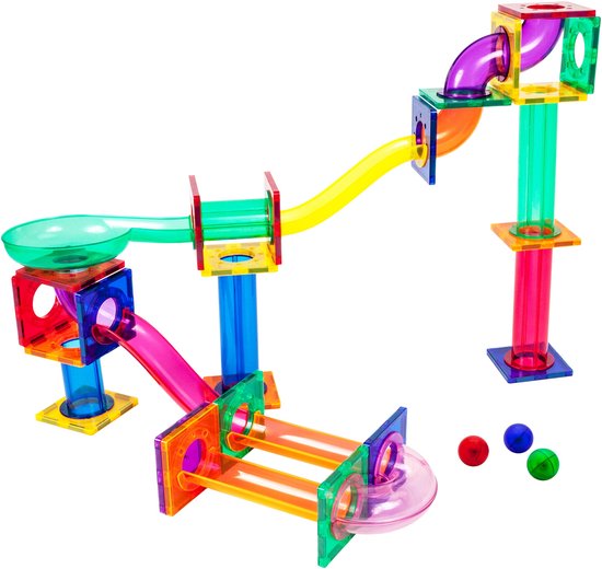 Laat knikkers razendsnel door bochten, glijbanen en trechters suizen met de Picasso Tiles PTG50 Marble Run Set. Deze 50-delige magnetische knikkerbaan combineert kleurrijke actie met educatief bouwplezier, perfe