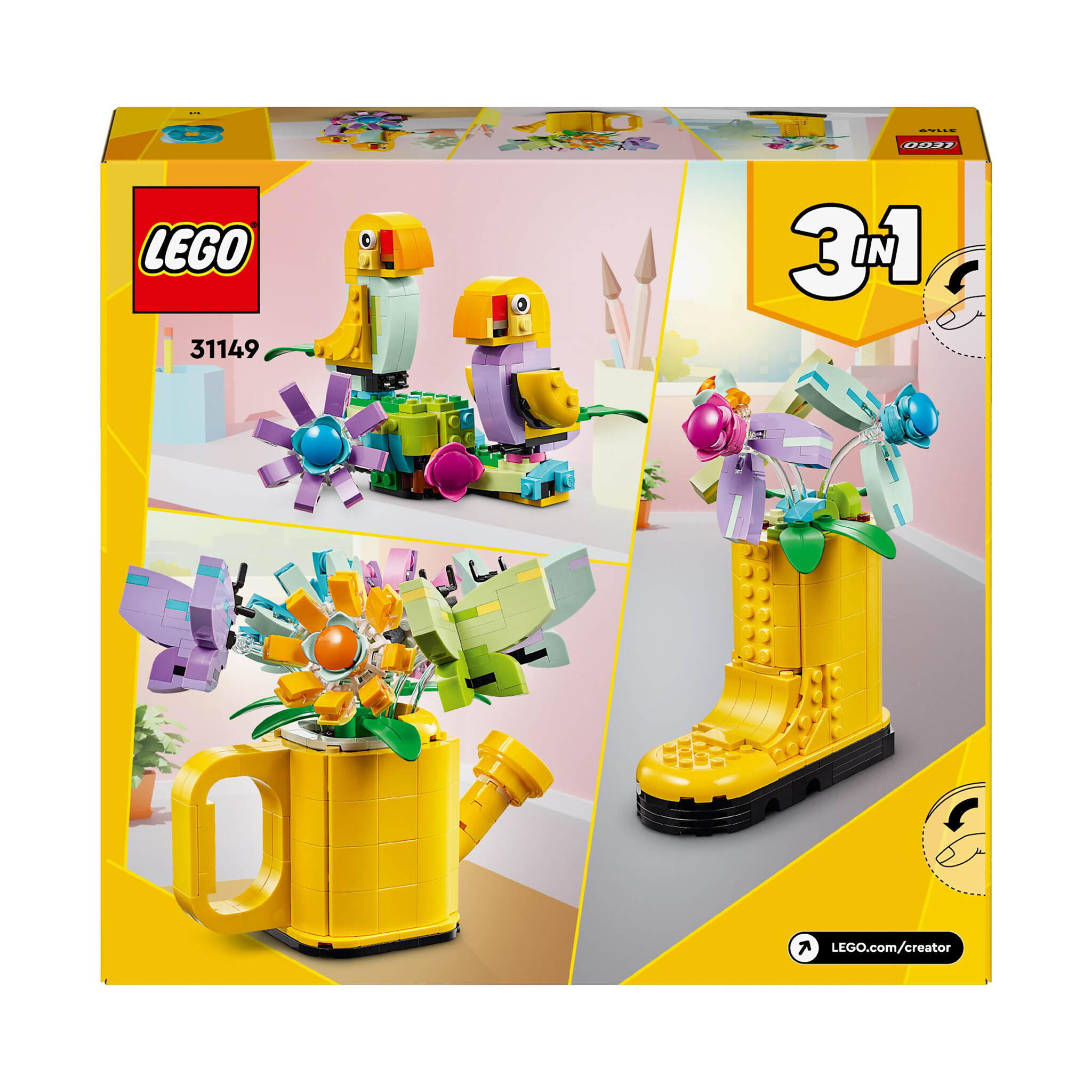 Bouwen en herbouwen, spelen en neerzetten: het kan allemaal met deze LEGO Creator 3in1 Bloemen in gieter (31149) set met 3 kleurrijke modellen geïnspireerd op de natuur. De 3in1 set bestaat uit een bouwbare gele speelgoed gieter met een handvat en een