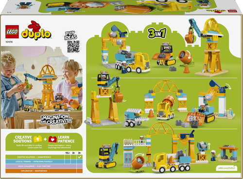 Laat kleine bouwvakkers kennismaken met het 3-in-1 bouwplaats en voertuigen (10476) speelgoed, waar het bouwplezier nooit ophoudt! Kinderen vanaf 3 jaar kunnen zich helemaal uitleven op een drukke bouwplaats, terwijl ze vrachtwagens laden en lossen, rotsb
