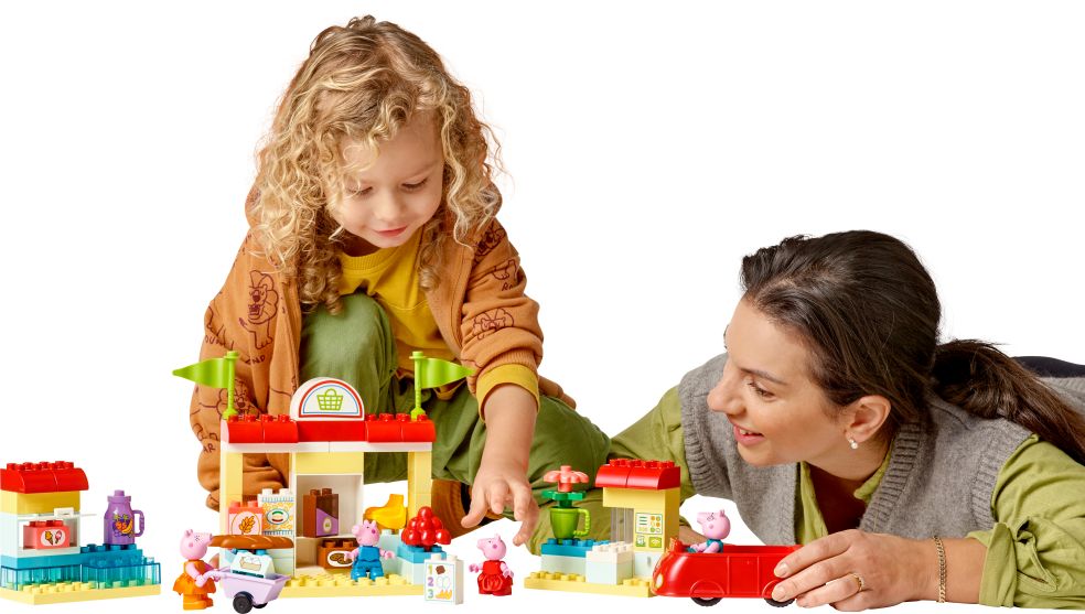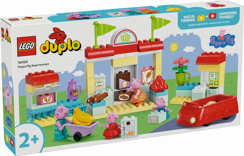 Help meisjes en jongens vanaf 2 jaar een uitstapje naar de supermarkt na te spelen met het LEGO® DUPLO® Peppa Big supermarkt (10434) speelgoed. Peuters worden deel van de familie wanneer ze eten kopen in de bekende rode auto uit de serie.Dit bouwspeelg