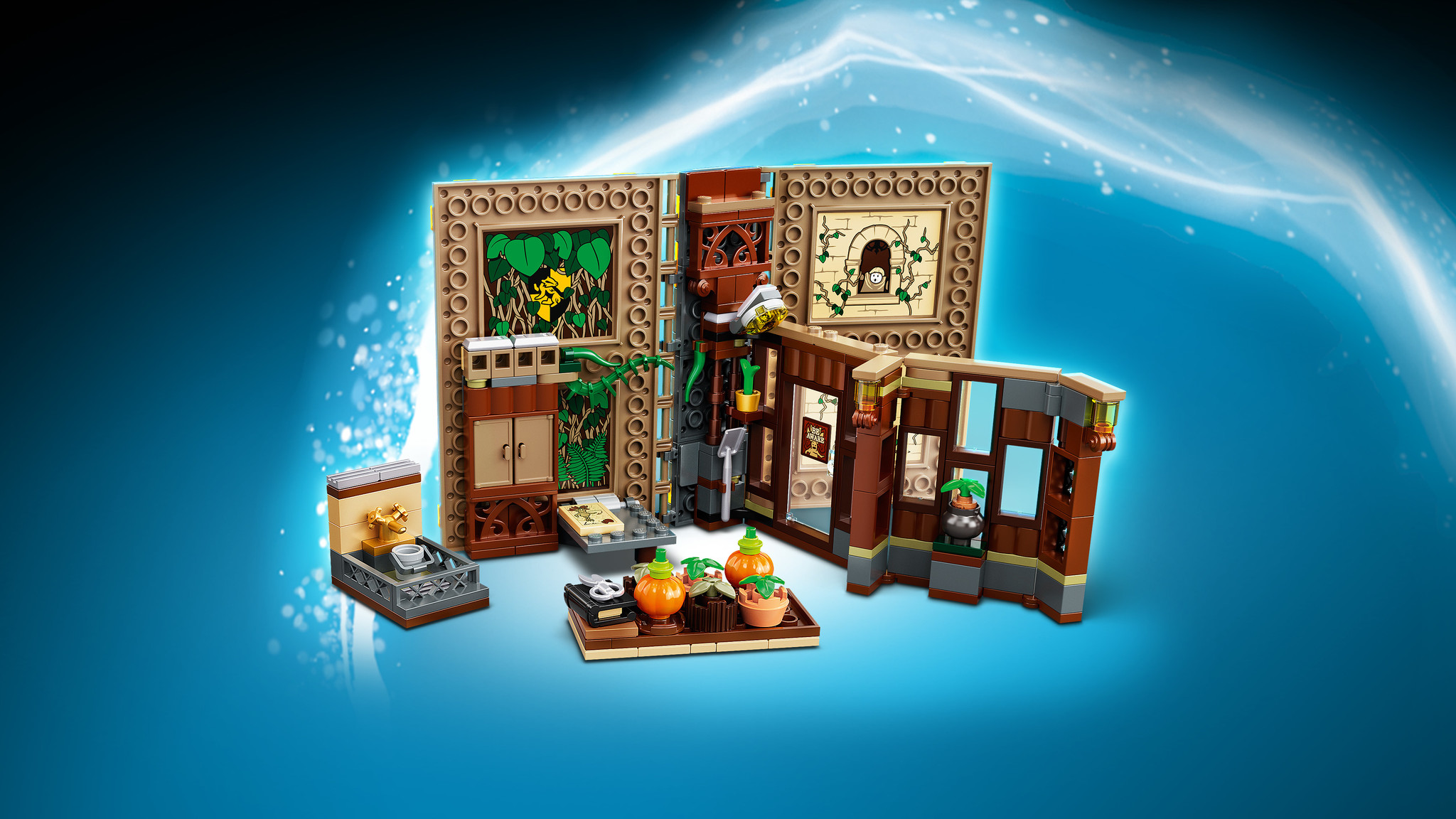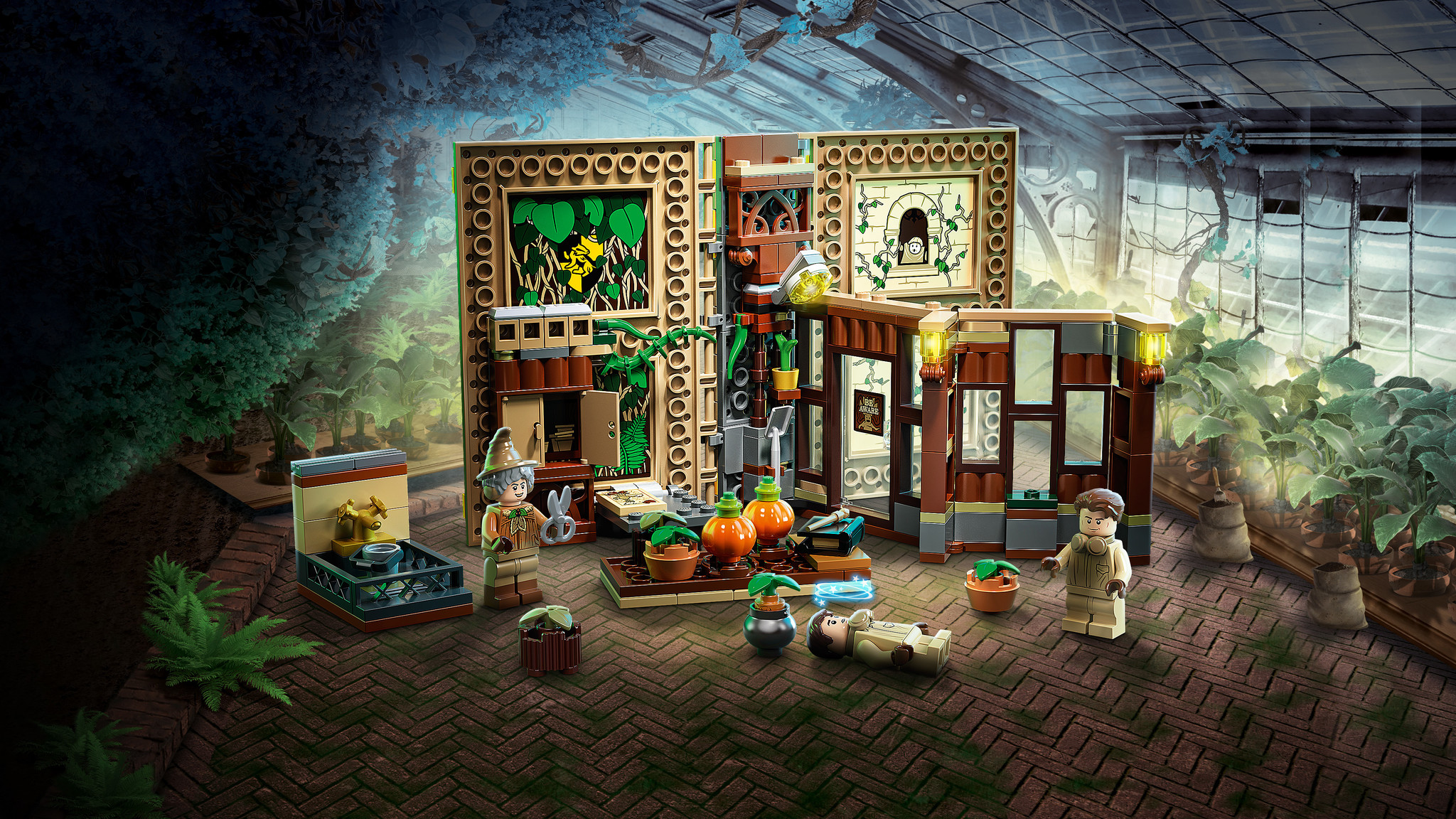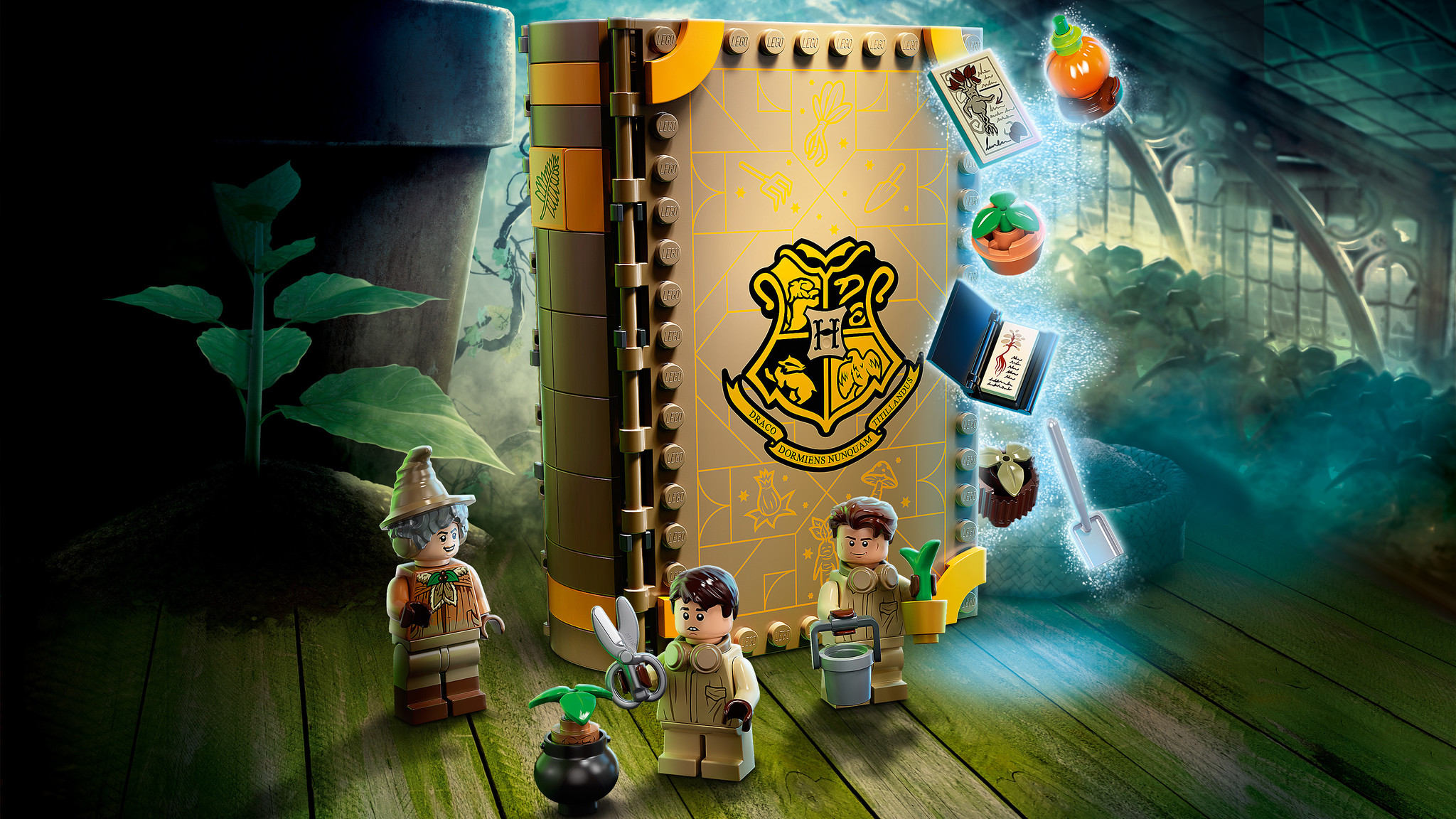 Open het speelboek van LEGO® stenen en stap binnen in de kassen van Zweinstein™! Professor Stronk geeft daar haar Herbologieles. Haal je spreukenboek uit de kast en volg samen met Carlo Kannewasser en Marcel Lubbermans™ een les in kruidenkunde van het hoo