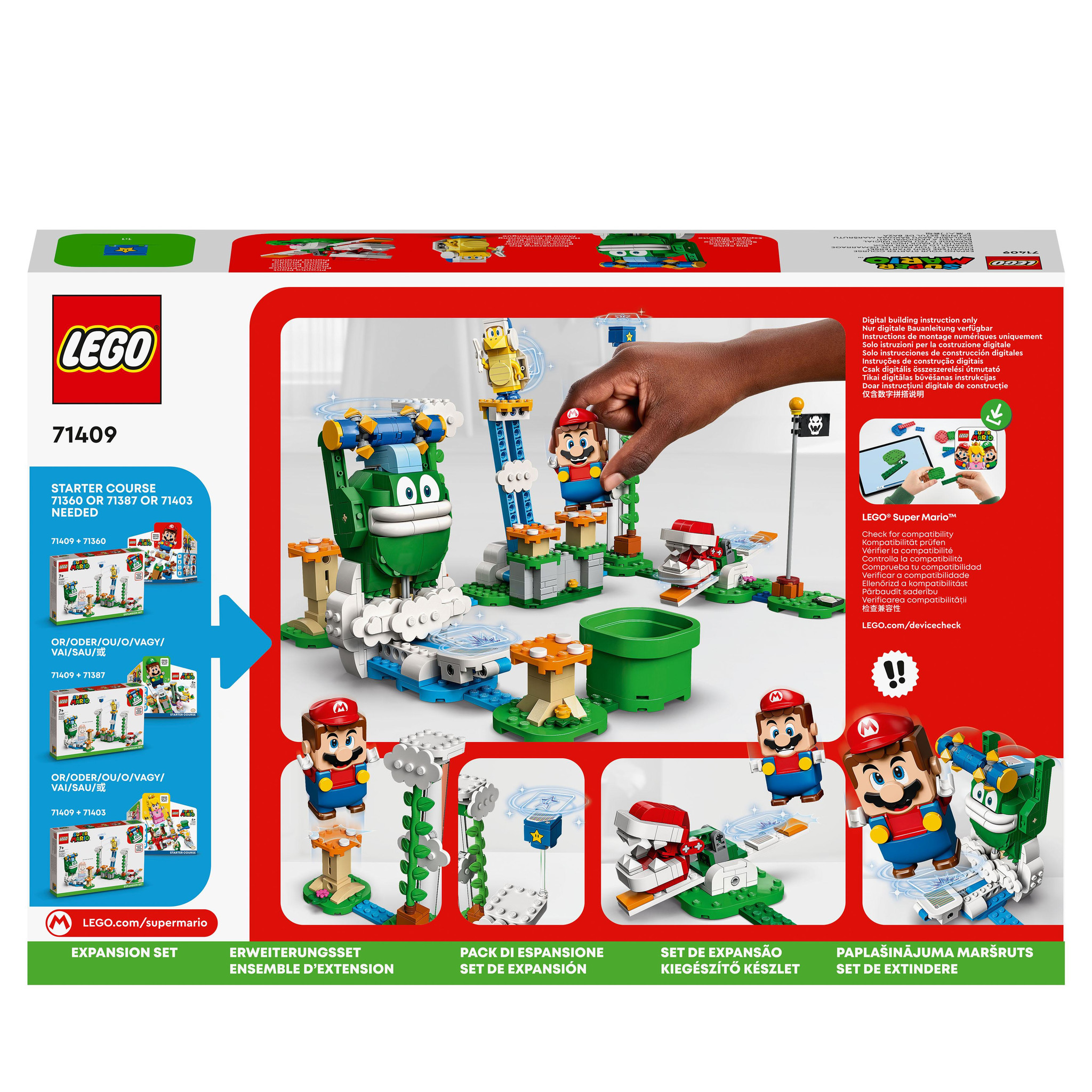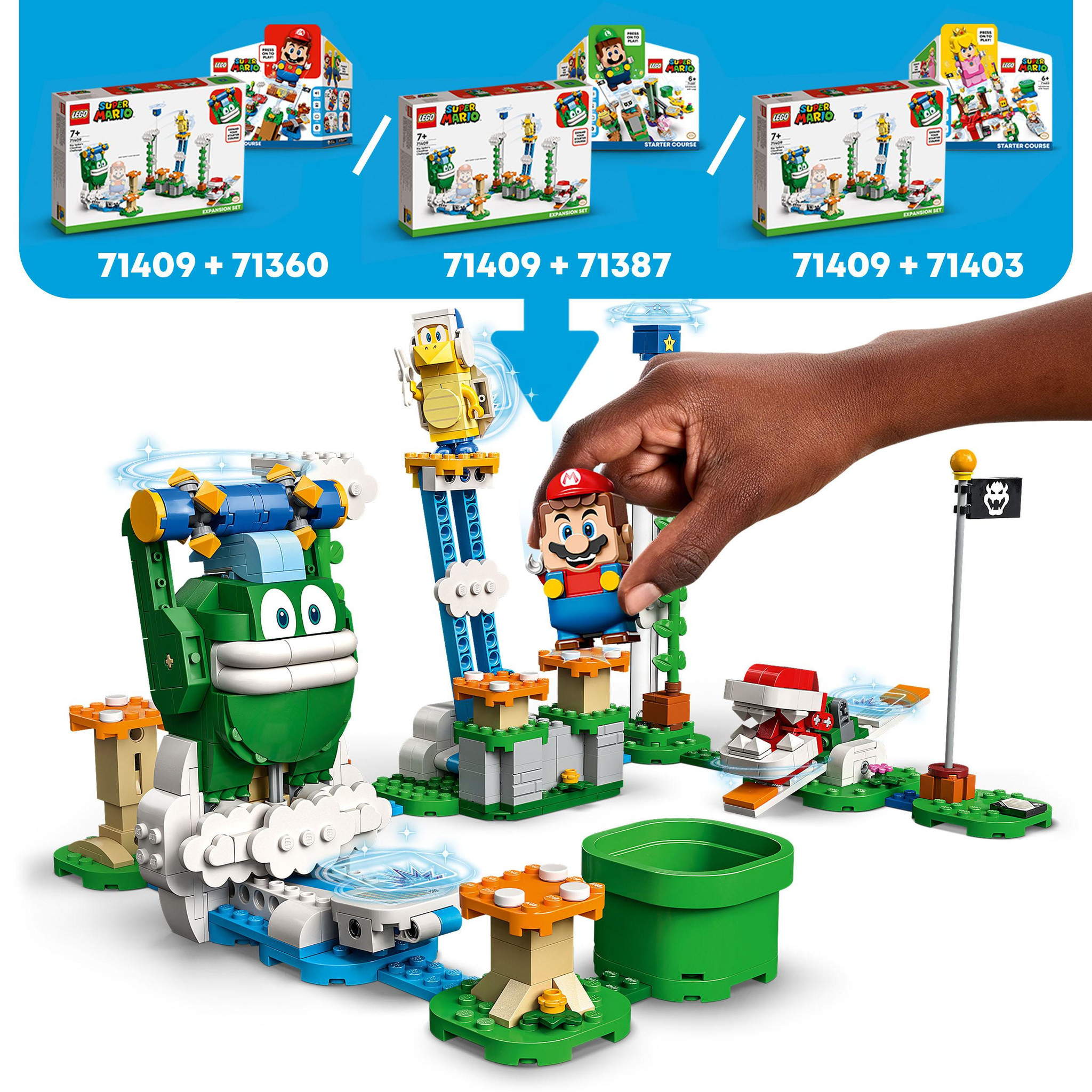 Kinderen kunnen een LEGO Super Mario level tussen de wolken maken met de Uitbreidingsset: Reuzen-Spikes wolkentop uitdaging (71409). Ze verdienen digitale munten door het met de LEGO Mario, LEGO Luigi of LEGO Peach figuren (niet inbegrepen) op te nemen te