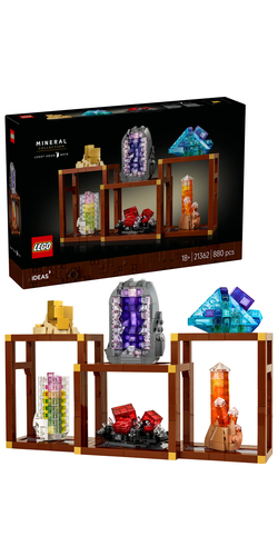 Gebruik slimme bouwtechnieken en transparante LEGO stenen om modellen te bouwen van goudkleurig pyriet, paarse amethist, blauw fluoriet, donkerroze toermalijn, rozerood rhodochrosiet en oranje kwarts. Zet de 3 planken in elkaar en bevestig je creaties erop. Rangschik de onderdelen op jouw manier en verplaats de mineralen om je display aan te passen.