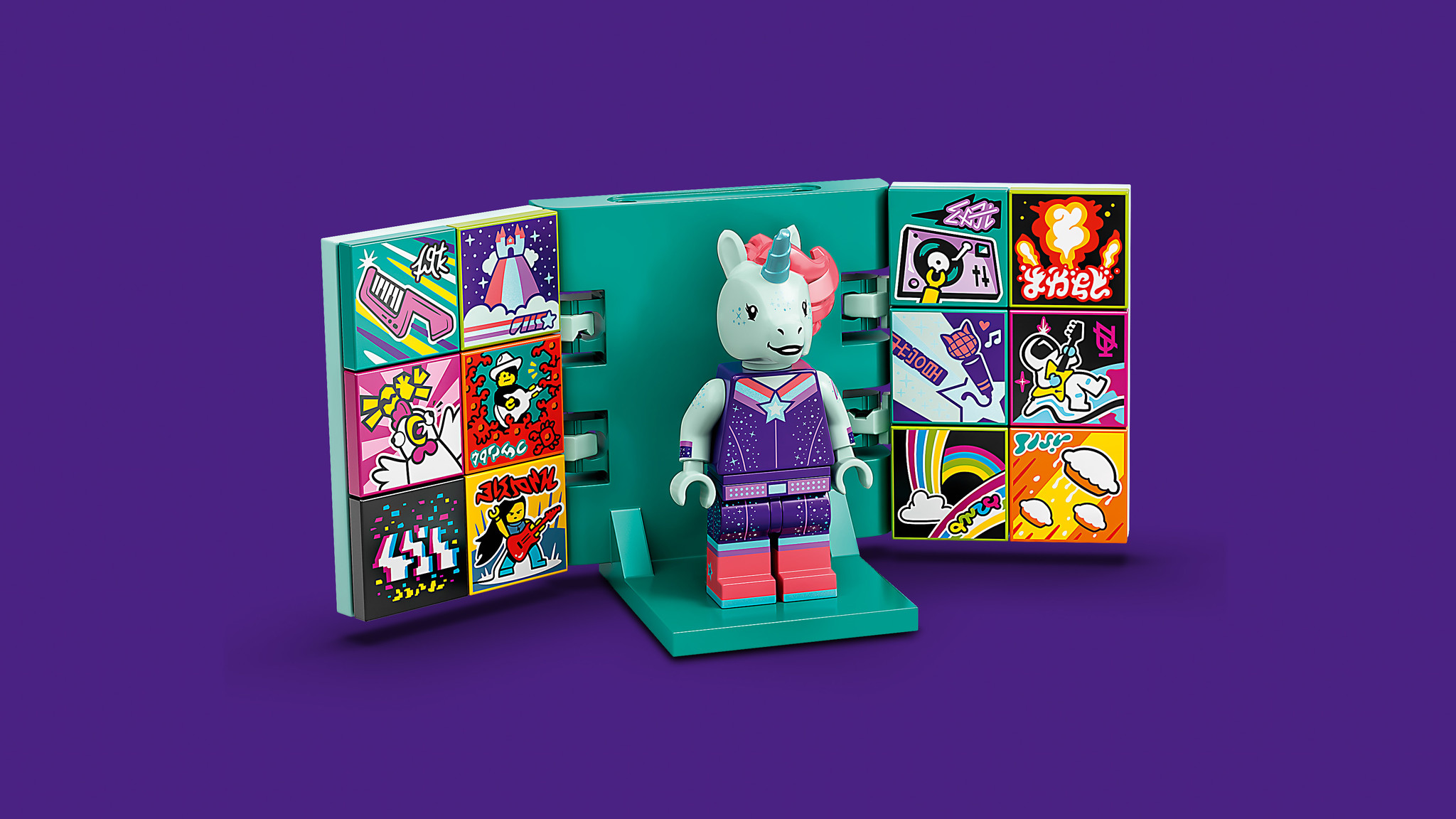 Regisseer, produceer en speel de hoofdrol in je eigen muziekvideo’s met de LEGO® VIDIYO™ Unicorn DJ BeatBox (43106) set. Gebruik de app om de eenhoorn-dj tot leven te brengen in een geweldige, op K-pop geïnspireerde muziekvideo die je online kunt delen. V