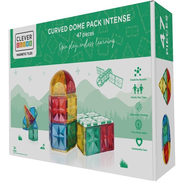 De Cleverclixx Curved Dome Pack bevat unieke afgeronde stukken! Deze set bestaat uit 47 tegels, geeft kinderen de mogelijkheid om grotere, complexere en nog indrukwekkendere bouwwerken te creëren. De speciaal ontworpen gebogen tegels voegen een nieuwe laag van creativiteit toe, waardoor de constructies van je kind niet alleen groter, maar ook veel unieker worden.
