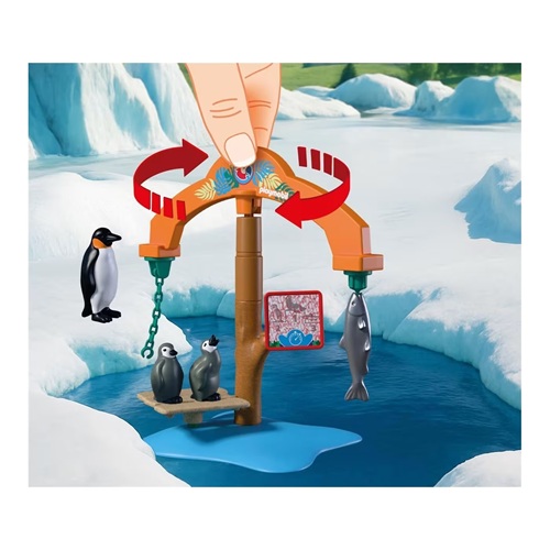 Tijdens de spannende ijsexpeditie maken kinderen kennis met de wereld van de pinguïns en zeehonden uit Antarctica. Vader en dochter kijken naar het levendige gedoe rond de grote voedercarrousel, die in alle richtingen kan draaien en met verschillende soorten voer kan worden gevuld. Bijzonder populair bij de dieren: de nieuwe dubbele glijbaan, waar de keizerspinguïn samen met zijn twee jongen vanaf glijdt. Met de innovatieve ontdekkingsbrillen kun je geheime informatie op de informatieborden over dieren zichtbaar maken – en de coole Motion Cards om te verzamelen lijken de dieren tot leven te wekken!