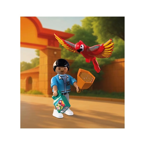 Het kleurrijke papegaaienkostuum zorgt voor een goed humeur bij kleine en grote bezoekers van de dierentuin van Playmo-City! Met een grappige kap, rugstuk en beweegbare vleugels wordt de mascotte van de dierentuin een echte blikvanger. Op de stangen zitten een toekan, kaketoe en papegaai – echte sterren uit de tropische vogelwereld! Een jonge bezoeker voert de kleurrijke vogels en beleeft de dieren van heel dichtbij.