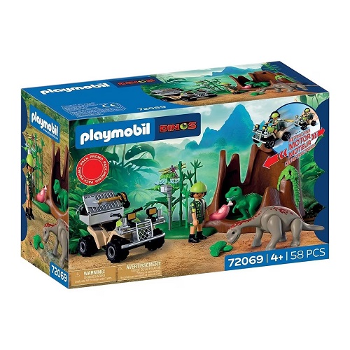 Met zijn quad en onderzoeksapparatuur is de onderzoeker onderweg in het dichte dinoterrein, wanneer hij plotseling iets ongelooflijks tegenkomt: een T-Rex-baby en een Brachiosaurus-baby – vredig naast elkaar in een uitgeholde boomstronk! Hij gaat snel aan de slag: terwijl hij hun geluiden documenteert, voorziet hij de twee van vlees en planten. Dankzij de terugtrekmotor is de quad altijd klaar voor gebruik.