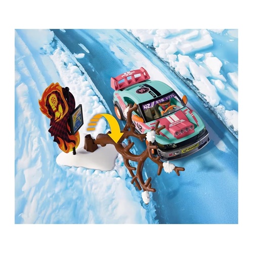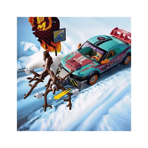 Met zijn slim getunede offroad-auto gaat de Japanse coureur graag de uitdaging van de “Ring of Fire”-race aan! Momenteel baant hij zich een weg door het ijzige Alaska, waar sneeuw, kou en omgevallen bomen alles van de coureurs vragen. Maar de coureur blijft cool: zijn voertuig biedt plaats aan twee figuren en is ook op een gladde ondergrond veilig te besturen. In de kofferbak ligt het benodigde gereedschap binnen handbereik voor snelle reparaties. Visueel valt de auto niet alleen op door de anime-artwork, maar ook door de achterspoiler en de opvallende motorkap met geïntegreerde koplampen – functioneel en stijlvol. En als er een obstakel de weg blokkeert? Geen probleem! De bumpers kunnen worden verwijderd en vervangen door een ram. Zo wordt zelfs de omverwerpbare boom in de set een klein detail in de race.