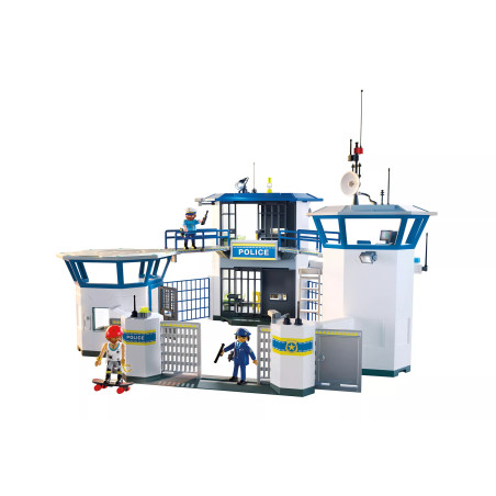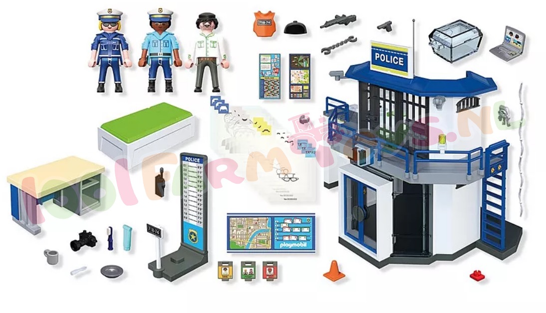 Het nieuwe politiebureau met opsporingsruimte kan met een loopbrug aan het grote politiecommando worden vastgebouwd. Naast de ingang kun je de politie helpen met het maken van de opsporingsfoto’s om de dieven te pakken en naar de gevangenis te brengen. Wat krast daar? – Oh nee, de boef heeft met zijn lepel een uitgang achter het toilet vrijgegraven. Maar de politieagente pakt hem snel weer. Zal zijn tweede ontsnappingspoging lukken? Stiekem laat hij zich aan de aan elkaar geknoopte lakens uit zijn cel naar beneden zakken. Help de twee politieagenten om hem te pakken. In het PLAYMOBIL Politiebureau met Onderzoekskamer blijft geen truc onopgemerkt! Maak de perfecte mugshot met de camera (inclusief transparante vellen) en hang hem op aan de boevenwand. Berg de spullen van de verdachte veilig op in een afsluitbare box – maar blijf alert! De gevangene kan proberen te ontsnappen met verborgen lakens of stiekem achter het toilet langs te glippen. Met geheime verstopplekken, slimme hulpmiddelen en spannende ontsnappingsroutes zit deze gedetailleerde PLAYMOBIL-set boordevol verrassingen. Inclusief drie figuren en veel realistische accessoires voor eindeloos speelplezier in de wereld van PLAYMOBIL!