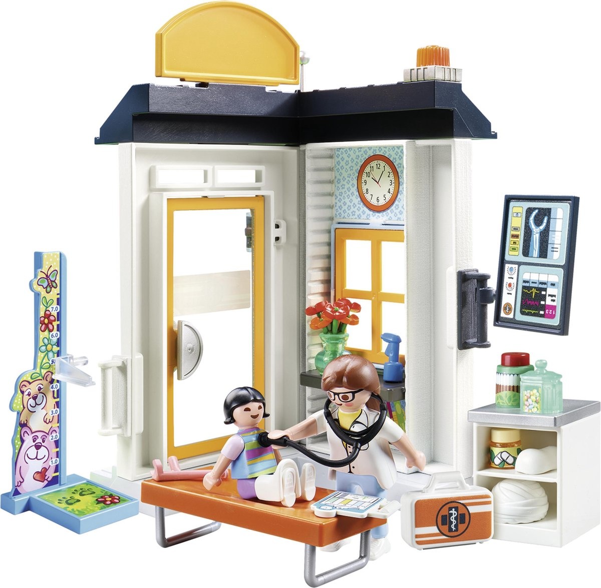 Welkom bij de vriendelijke PLAYMOBIL kinderartspraktijk. Hier worden kleine patiënten liefdevol verzorgd. Een meisje heeft een ongeluk gehad op straat. De behulpzame kinderarts onderzoekt het kind aandachtig op de onderzoeksbank en luistert zachtjes na