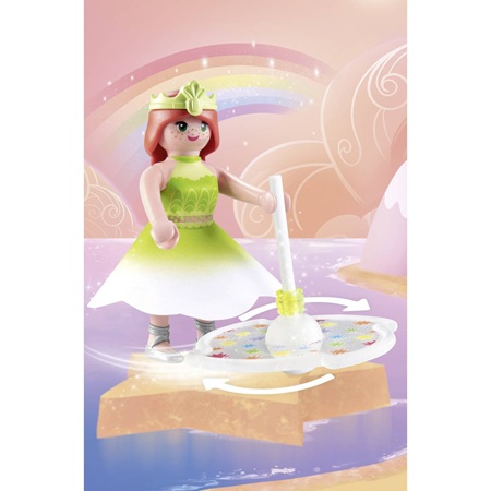 Beleef magische momenten op de Regenboogtop, waar de prinses schittert in haar wolkenrok en glinsterende tiara. Laat de speciale tol draaien en zie een kleurrijke regenboog verschijnen – een betoverend effect dat je keer op keer wil beleven. De zachte rok klik je makkelijk rond de prinses, perfect voor koninklijke avonturen in de wolken. Een dromerige speelset vol fantasie en glans, ideaal voor kleine prinsessenliefhebbers!