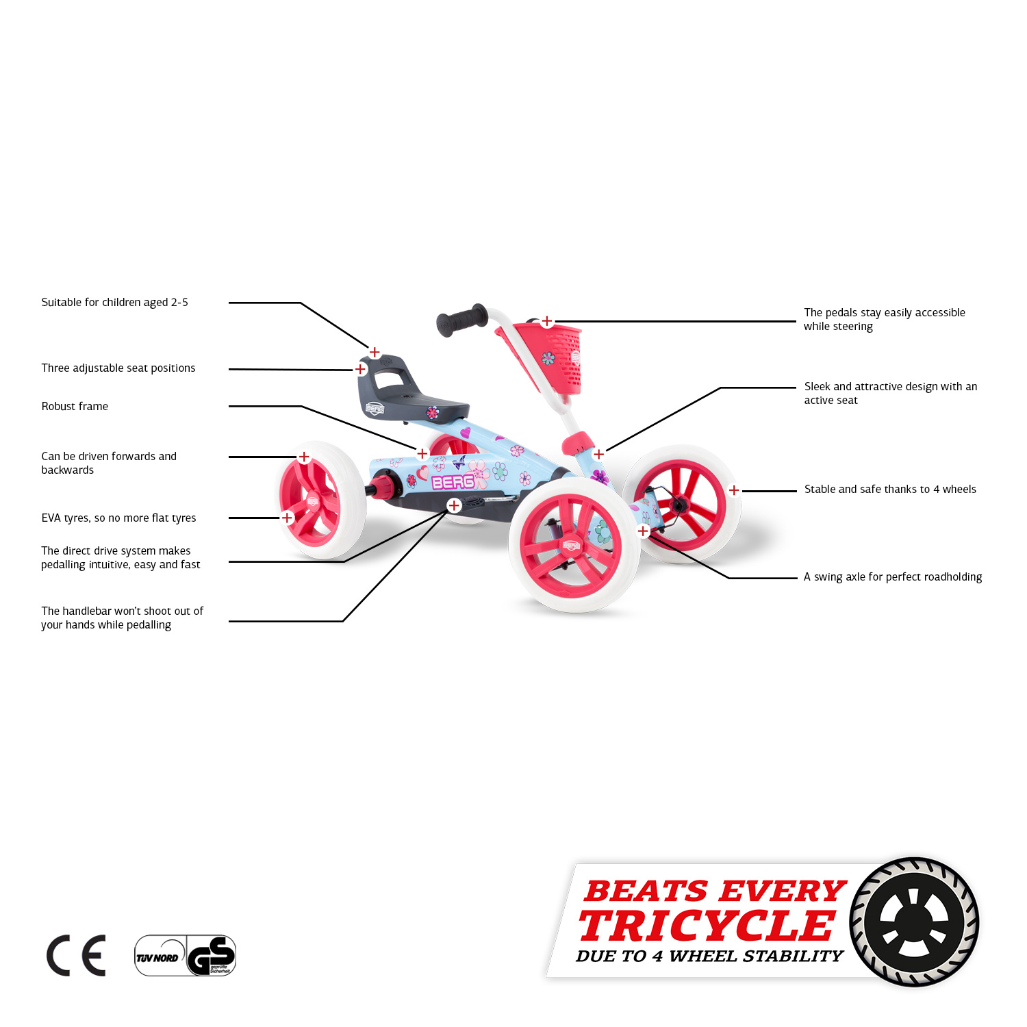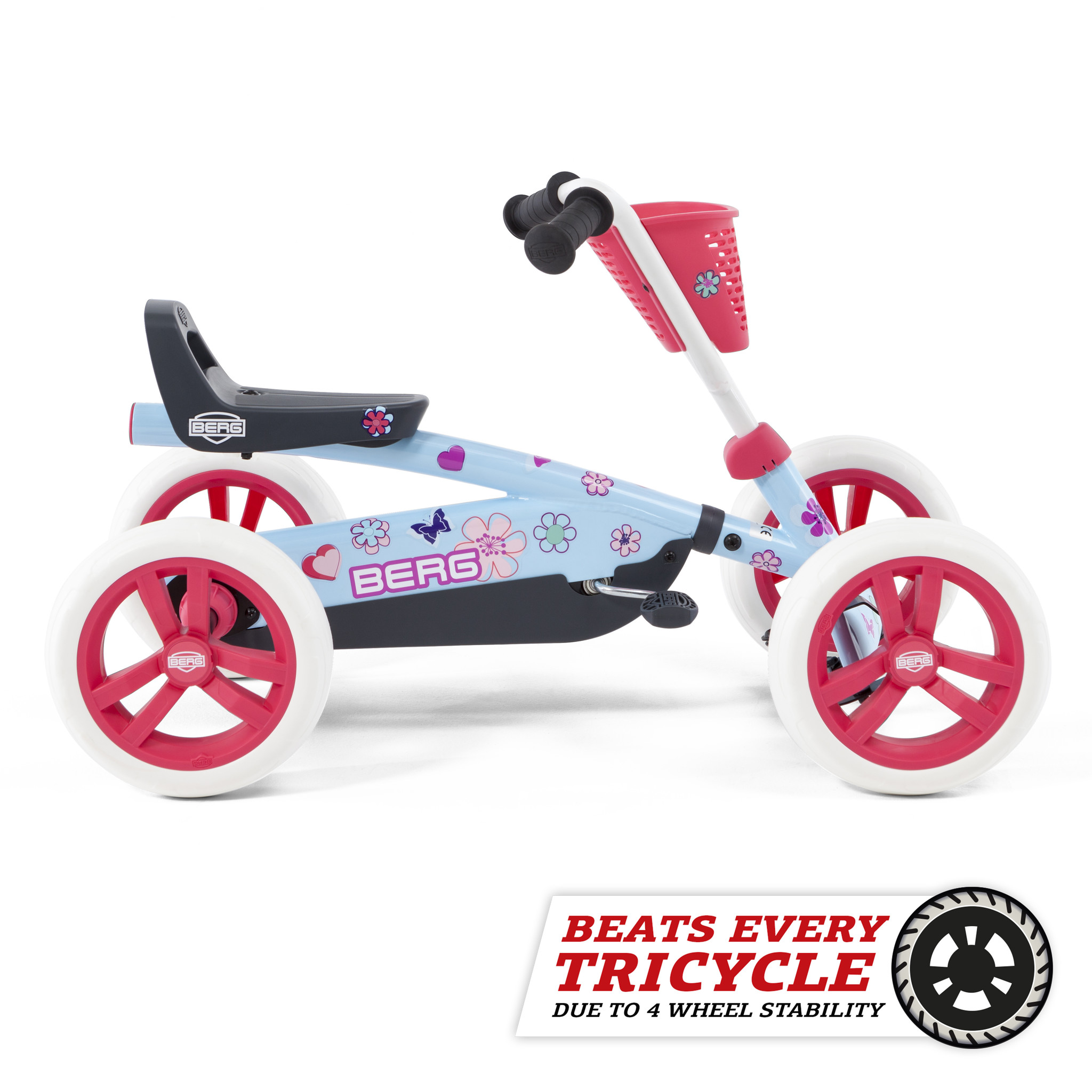 Voor de jonge kinderen is er nu ook de BERG Buzzy Bloom! De skelter met de lieve uitstraling en het handige opbergmandje voorop, ideaal natuurlijk om je speelgoed in te vervoeren. Kinderen van 2 tot 5 jaar kunnen meegroeien met deze skelter, zowel het