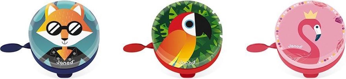 Assortiment van 12 metalen bellen (3 verschillende modellen – Beauty (met de roze flamingo), Biker Club (met de vos) en Jungle (met de papegaai)) geschikt voor alle soorten rijwielen (metalen ring voor bevestiging rond het stuur).