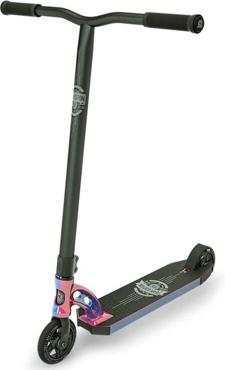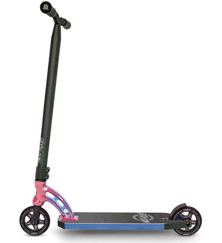 Een neochrome stuntstep is altijd speciaal en al zeker de MGP VX Rush. Roze en blauw zijn de kleuren die zich mengen doorheen de headtube en het deck. Het deck is afgewerkt met Neo Rush griptape en MFX blocks voor en achter. Met 84cm stuurhoogte en 120mm