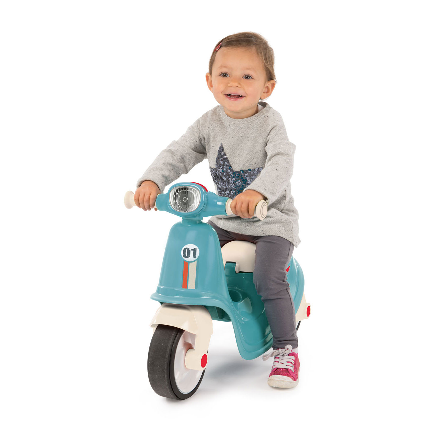 Wat een gave loopfiets! Deze loopfiets van Smoby is uitgevoerd in een retro scooter design. De blauwe ride on heeft een realistische plastic koplamp en een mechanische sleutel. De scooter heeft stille soft wielen en onder de stoel zit een opbergvak. Stop je favoriete speelgoed in de scooter, draai de sleutel om en je bent klaar om te vertrekken!