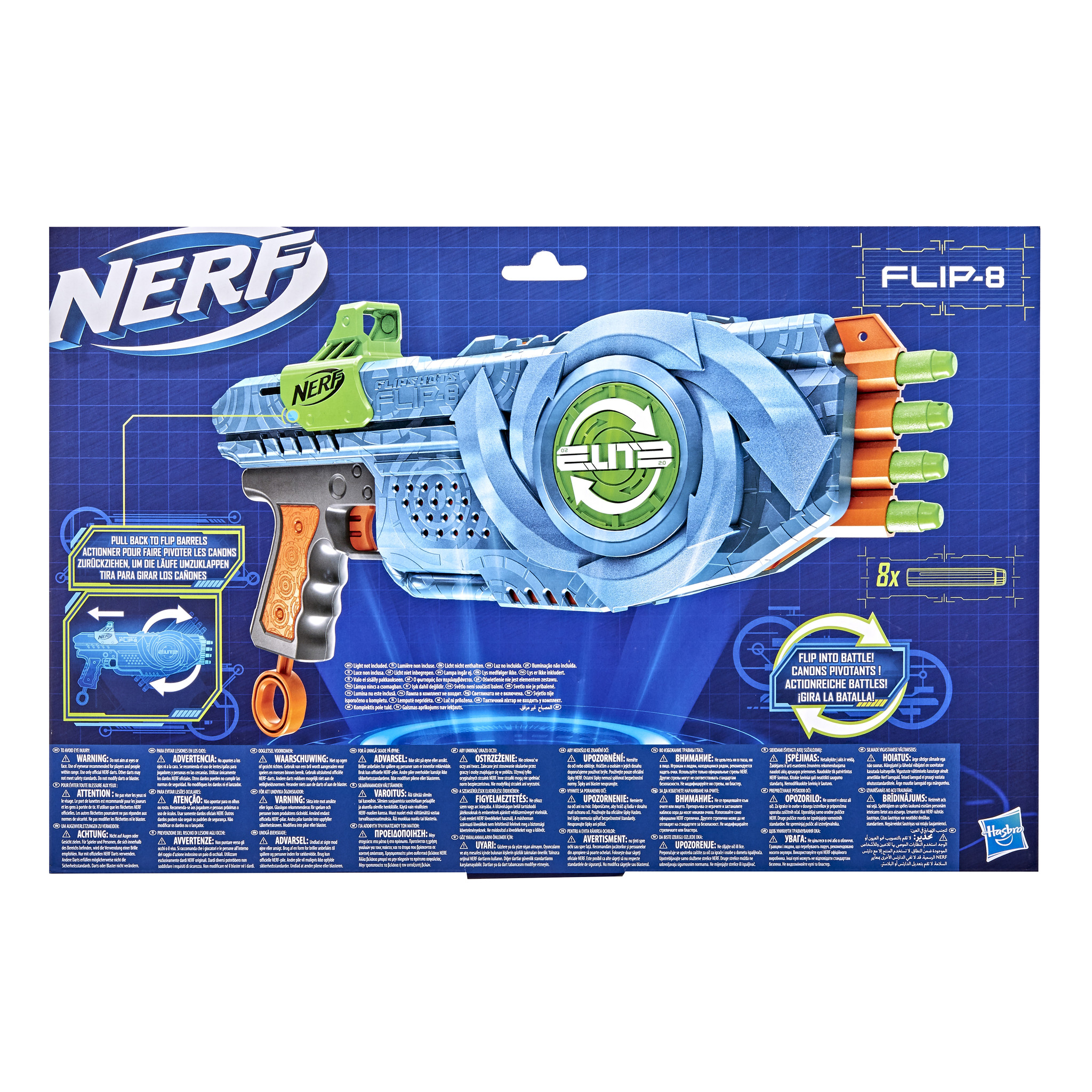 Gooi je in de strijd met de Nerf Elite 2.0 Flipshots Flip-8-blaster! De blaster heeft 8 lopen — 4 die naar voren zijn gericht en 4 die naar achteren zijn gericht. Vuur darts af van de 4 naar voren gerichte lopen en keer de 4 naar achteren gerichte lop
