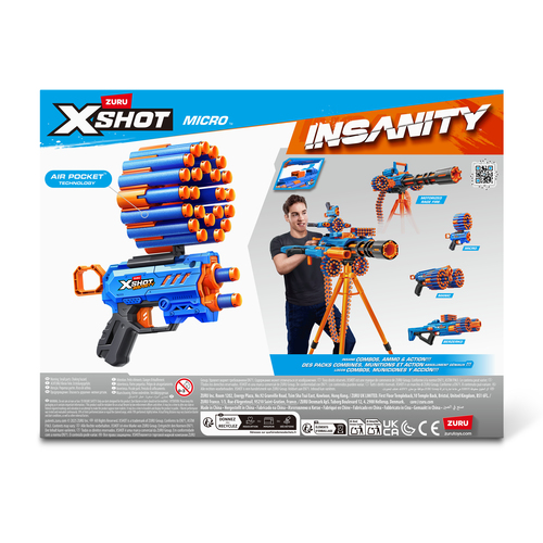 Overrompel je tegenstanders met de XSHOT Insanity Micro Blaster! Deze kleine, maar krachtige blaster heeft een 24-dart capaciteit en twee modulaire dart opslagcapaciteiten aan de zijkanten voor onvermoeibaar schietwerk. Het is het nieuwste model in de iconische Insanity-serie, met een compact formaat, waardoor je het eenvoudig kunt verbergen voor een verrassingsaanval. Combineer hem voor de ultieme dominatie met de rest van de Insanity serie en breng je spel naar de NEXT LEVEL. Geniet van eindeloze actie met extra munitie en dartpijlen met geavanceerde schuimtechnologie. Met het eenvoudige oplaadmechanisme blijf je in de strijd, terwijl je met de geavanceerde vuurkracht doelen tot 30 m ver kunt raken. Met de XSHOT Insanity Micro Blaster ben je klaar voor ieder intens blaster-gevecht!