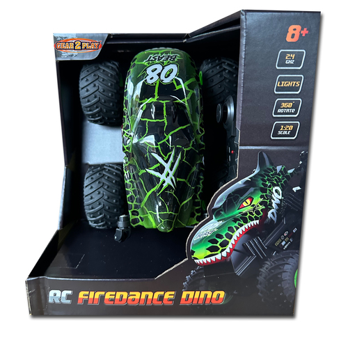 Deze op afstand bestuurbare stuntauto met een schaal van 1:20 heeft een stoer body design van een Dino. Zijn body is tevens voorzien van coole lichteffecten die zichtbaar zijn tijdens het rijden en nog meer beleving geven tijdens het rijden. Bestuur deze auto op vier wielen of laat hem verticaal rijden op zijn speciale achterbanden, WoW! Deze stunter maakt 360 graden spins en is voorzien van een oplaadbare LiPo 3.7V batterij die je kunt opladen via USB. Frequentie: 2.4 Ghz. Leeftijdsindicatie: 8 jaar+.