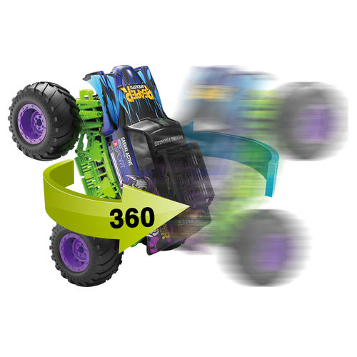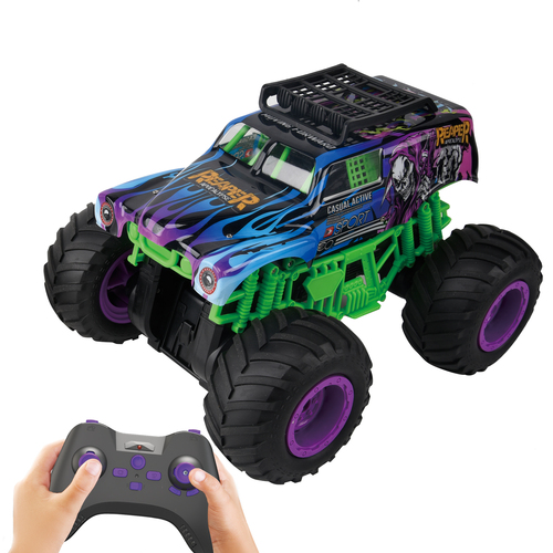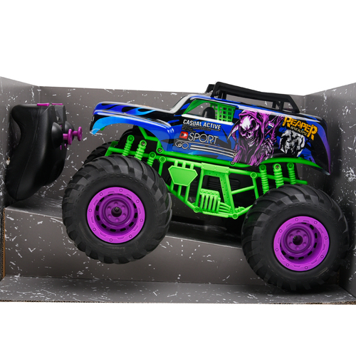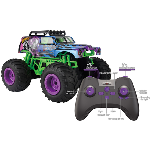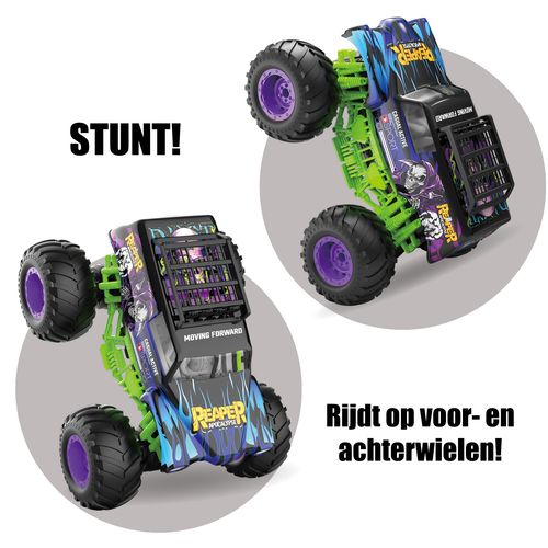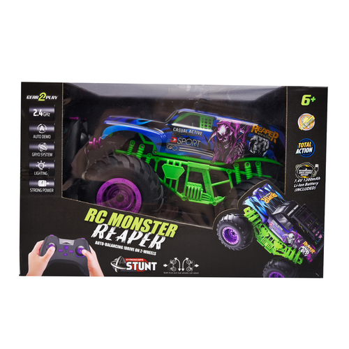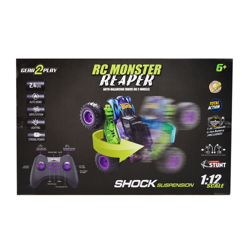 De Gear2Play RC Monster Reaper is een stoere, stuntende Monstertruck met een schaal van 1:12. Door de krachtige motor kan deze auto snelheden tot maximaal 10 km/u halen. Met de controller stuur je deze monstertruck alle kanten op en door het ingebouwde gyro systeem zal deze monstertruck met een druk op de knop op zijn achter- of voorbanden balanceren en rijden! Hij maakt zelfs 360 graden spins terwijl hij rechtop staat! De auto is uitgerust met rood en blauwe LED lichtjes voor nog meer speelplezier en beleving. Ook is hij voorzien van een auto demo knop, gyro systeem en een meegeleverde oplaadbare batterij. Geschikt voor zowel binnen als buitenshuis. Frequentie: 2.4 Ghz. Batterij informatie: Auto: 1 x 7.4V 1200mAh Li-ion batterij (meegeleverd) – Controller: 2 x AA batterijen (niet meegeleverd). Leeftijdsindicatie: 5 jaar+.