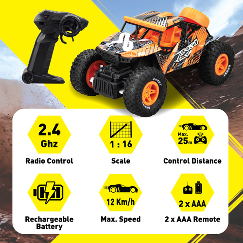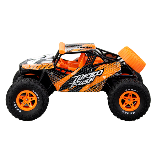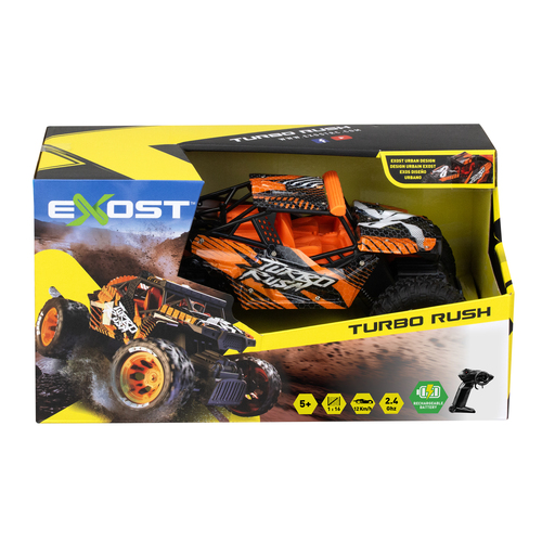 De Exost RC Turbo Rush is een op afstand bestuurbare terreinauto met een schaal van 1:16. Dit krachtige 2.4 Ghz RC voertuig heeft een stoere ATV cross county carrosserie en kan rijden over alle ondergronden, zowel binnen als buiten. Met de afstandsbediening stuur je deze auto alle kanten op: vooruit, achteruit, naar links en rechts. De duurzame banden ondersteunen je rijavontuur met precisie tot op 25 meter afstand. De X-Wildfire behaalt snelheden tot 12 km/u. Het voertuig is uitgerust met een via USB oplaadbare batterij!