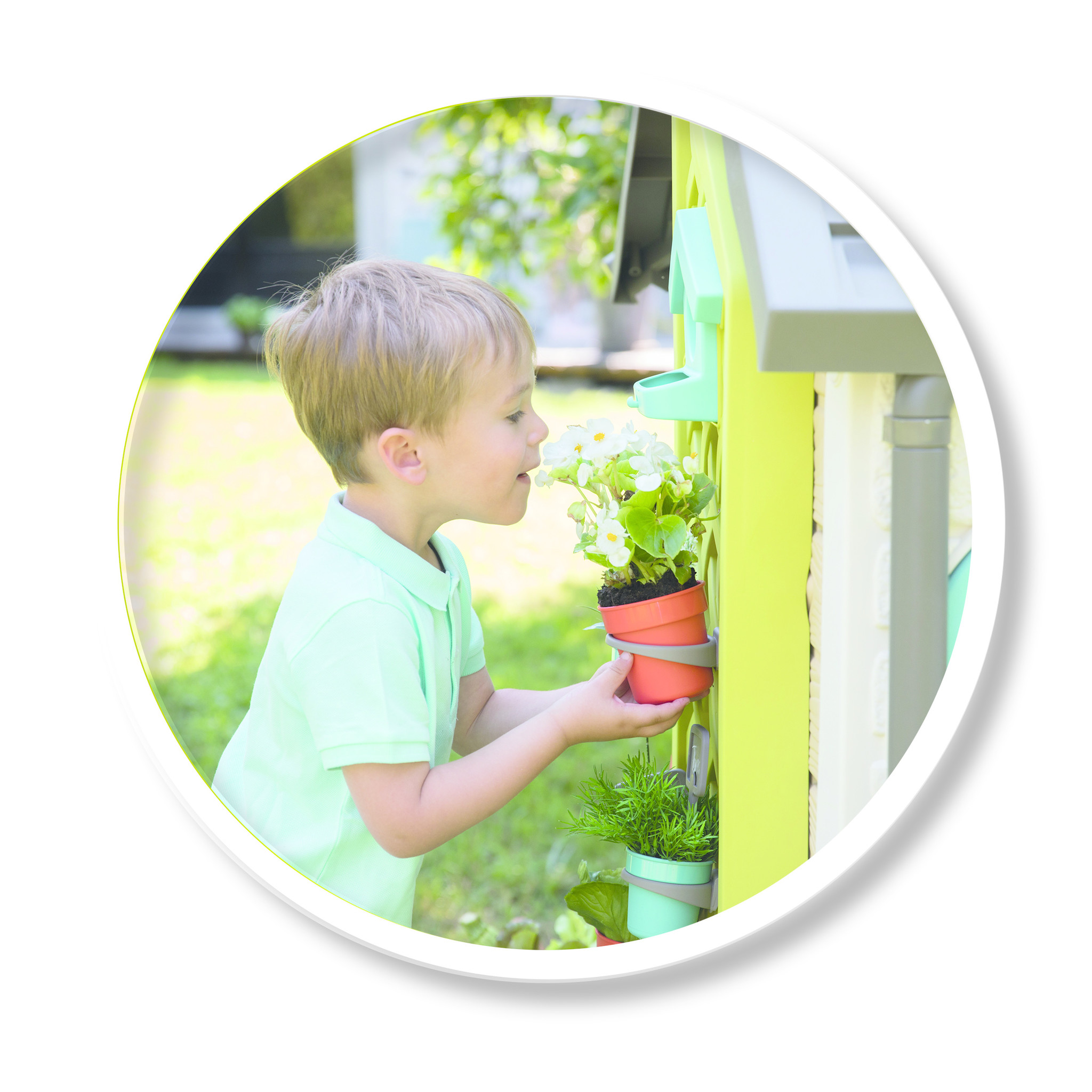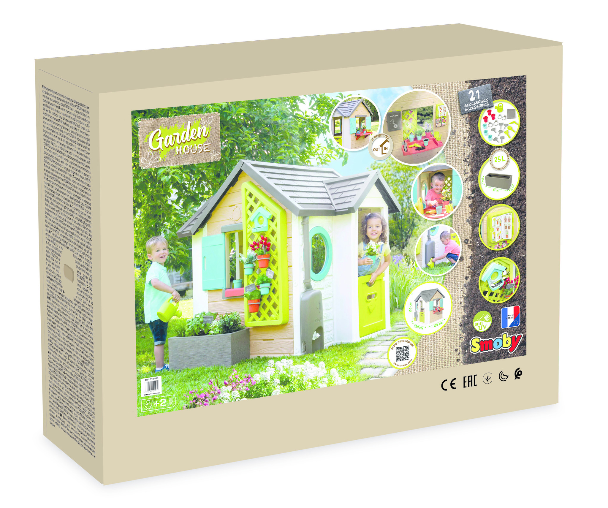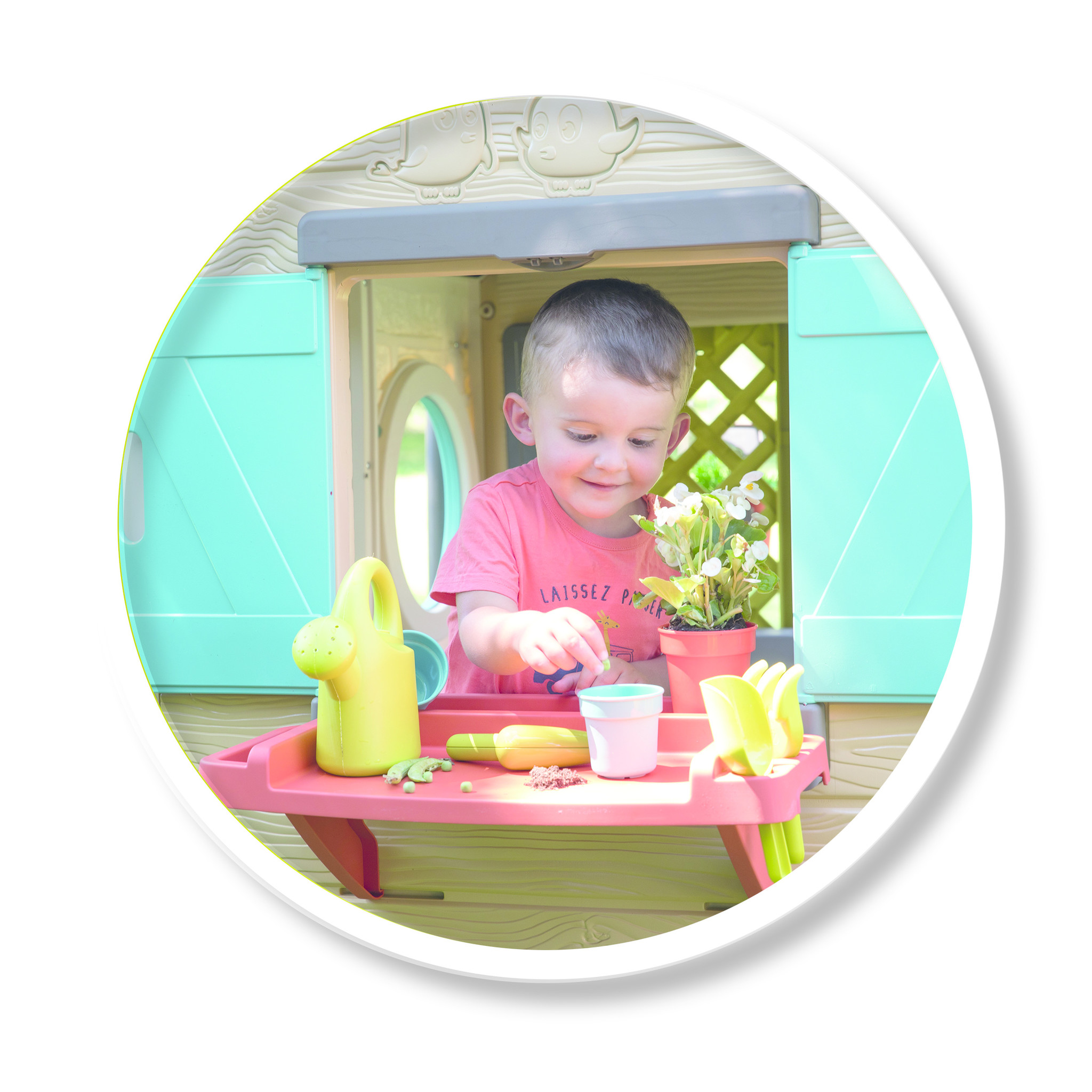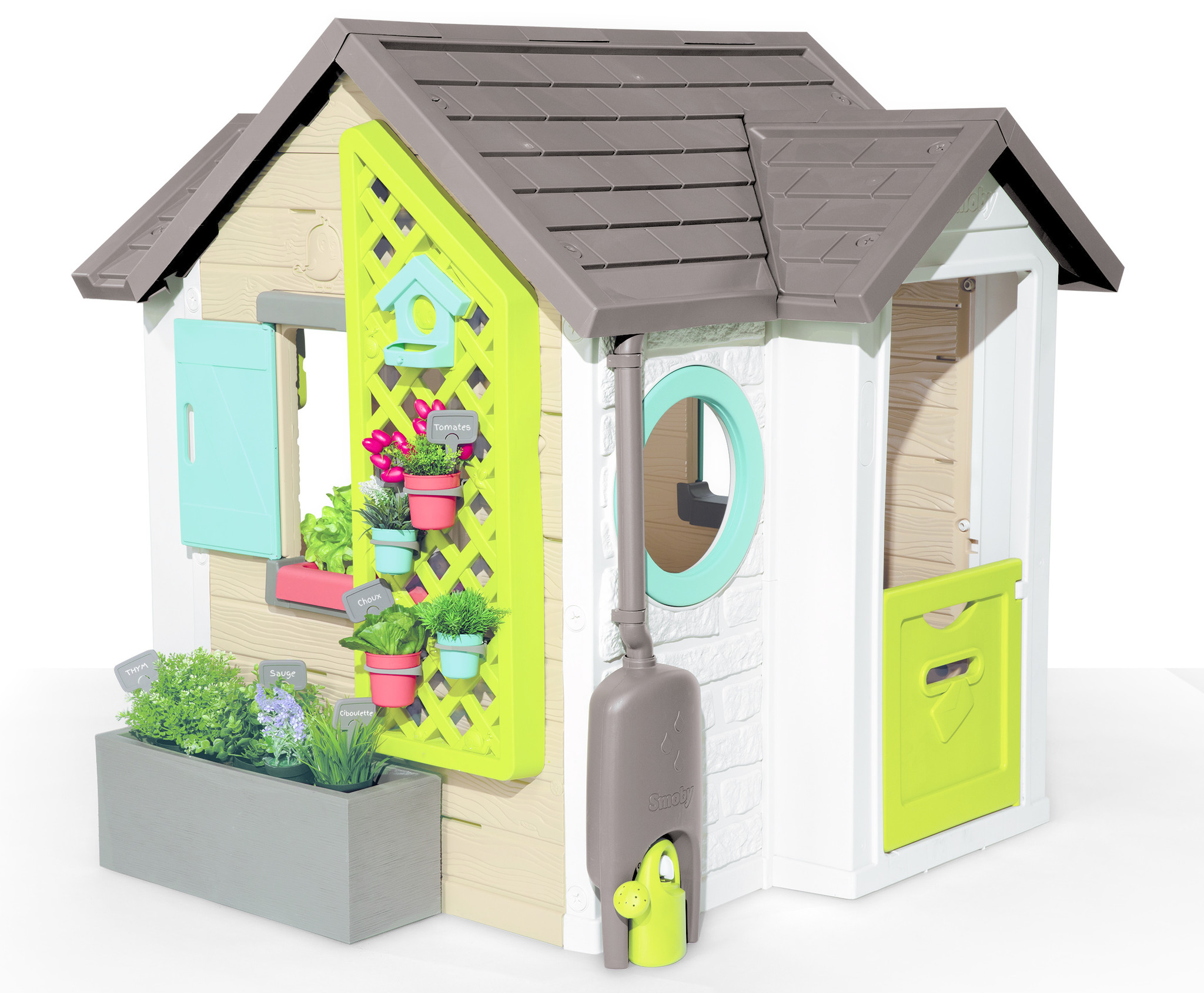 Eigentijds huis met natuurlijke en plantaardige kleuren, met als thema tuinieren. Het tuinhuis heeft 2 poorten, 2 ramen met luiken bladeren en 2 patrijspoorten. Er zijn veel spelfuncties inbegrepen: een grote plantenbak, een latwerk voor het ophangen v