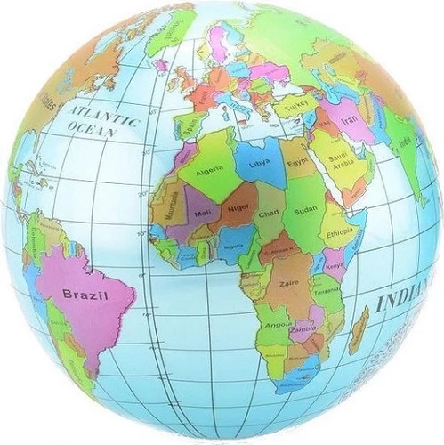 Outdoor Fun bal (87 gram) in de vorm van een wereldbol. De bal is opgeblazen 18 centimeter groot. Hij wordt leeg geleverd en kan worden opgeblazen met een ventiel en (ballen)pompje. Geschikt vanaf 4 jaar.
