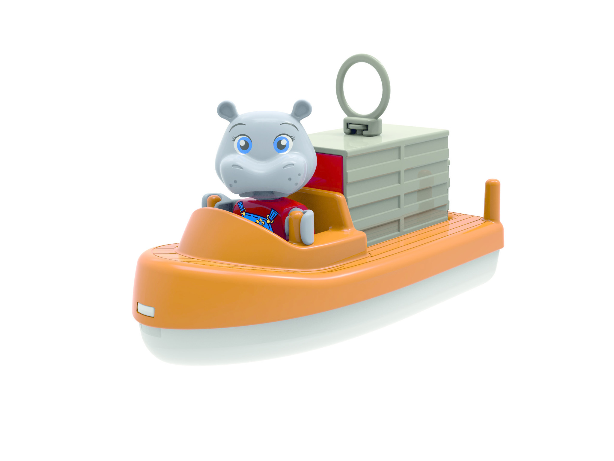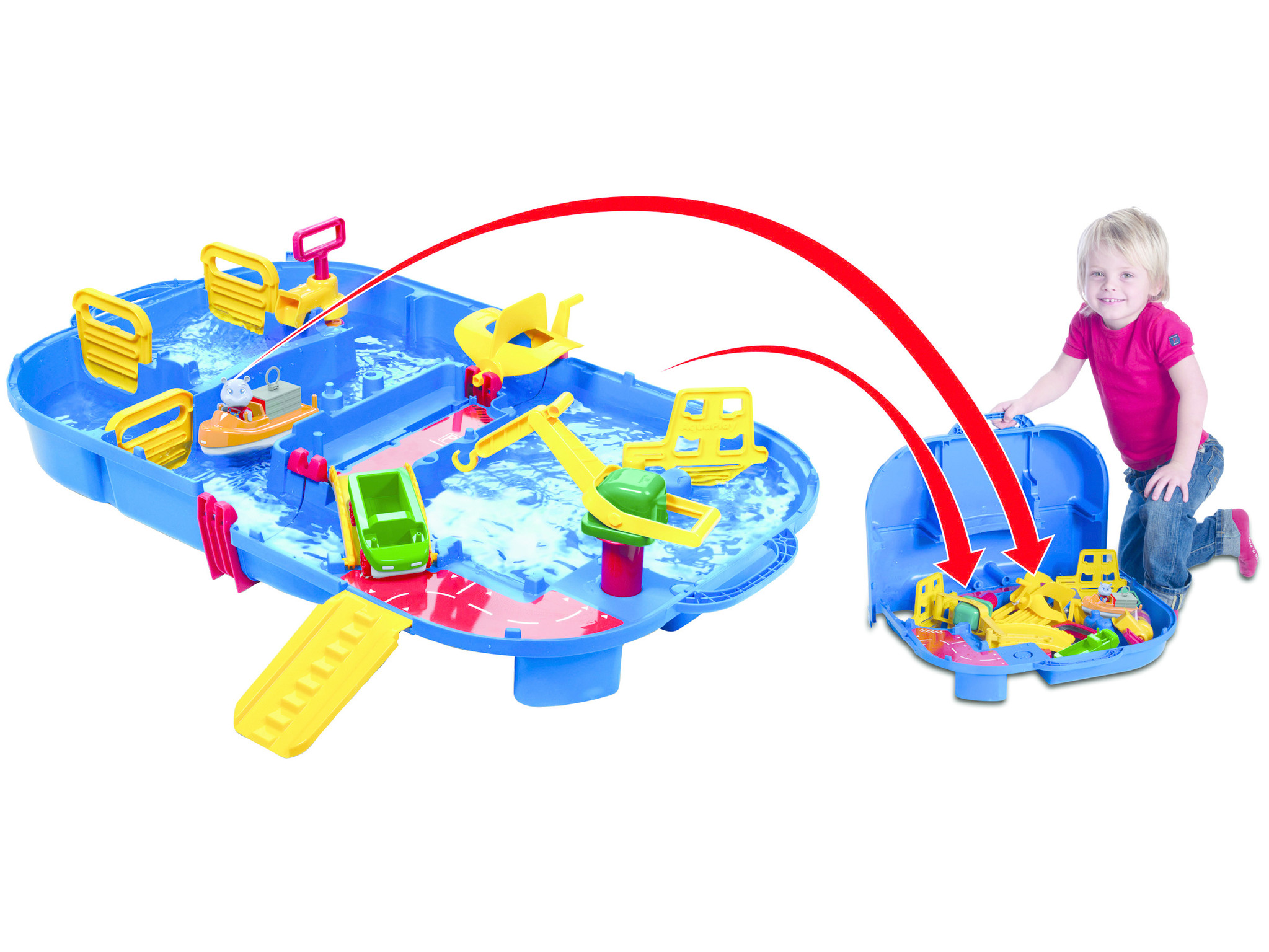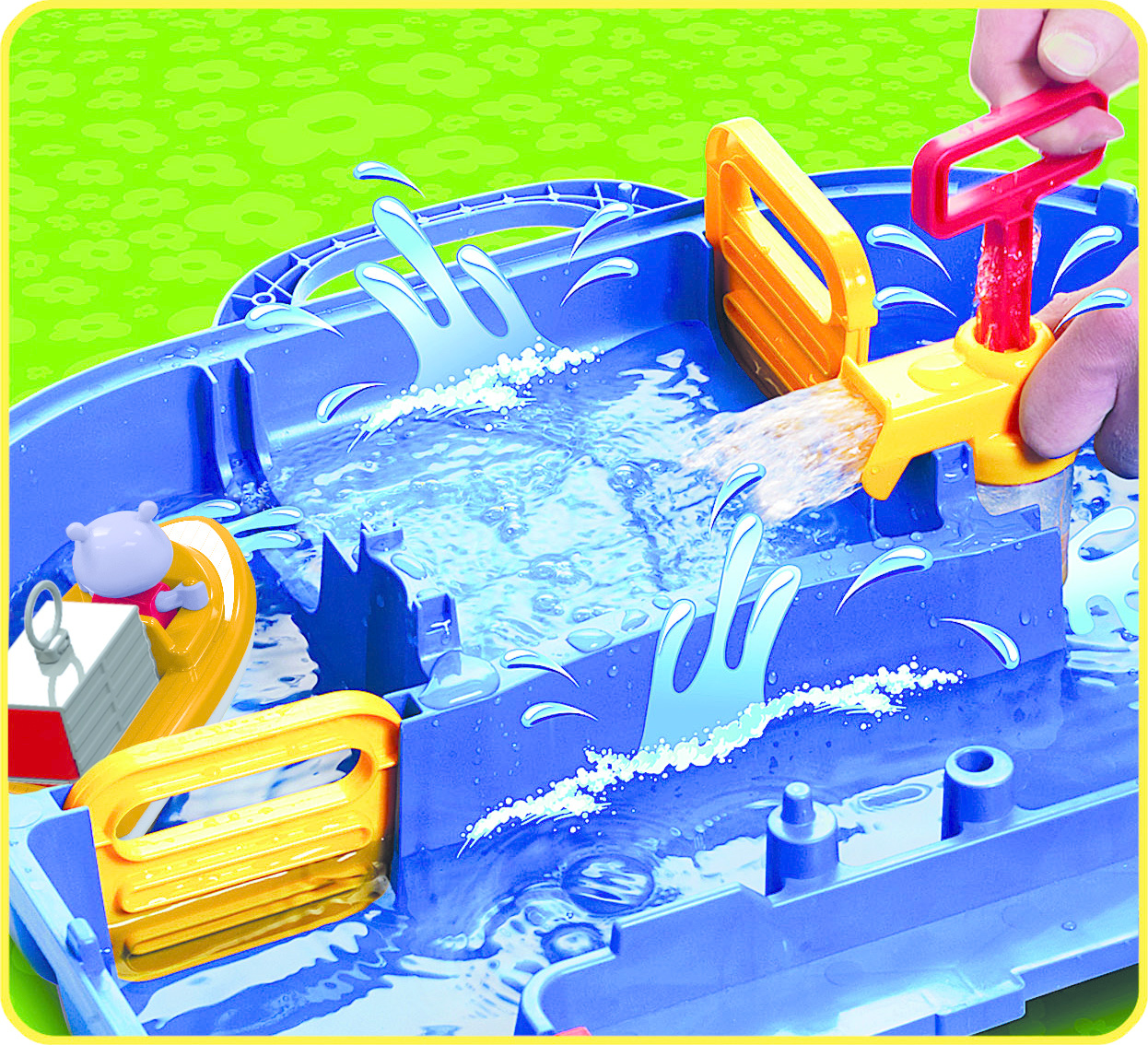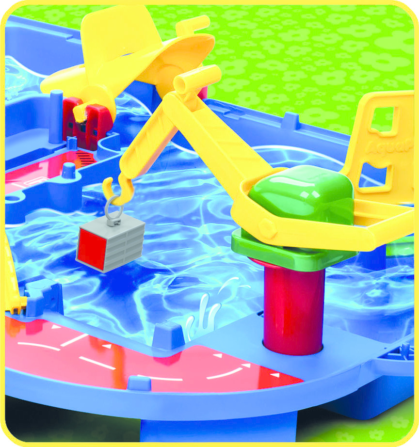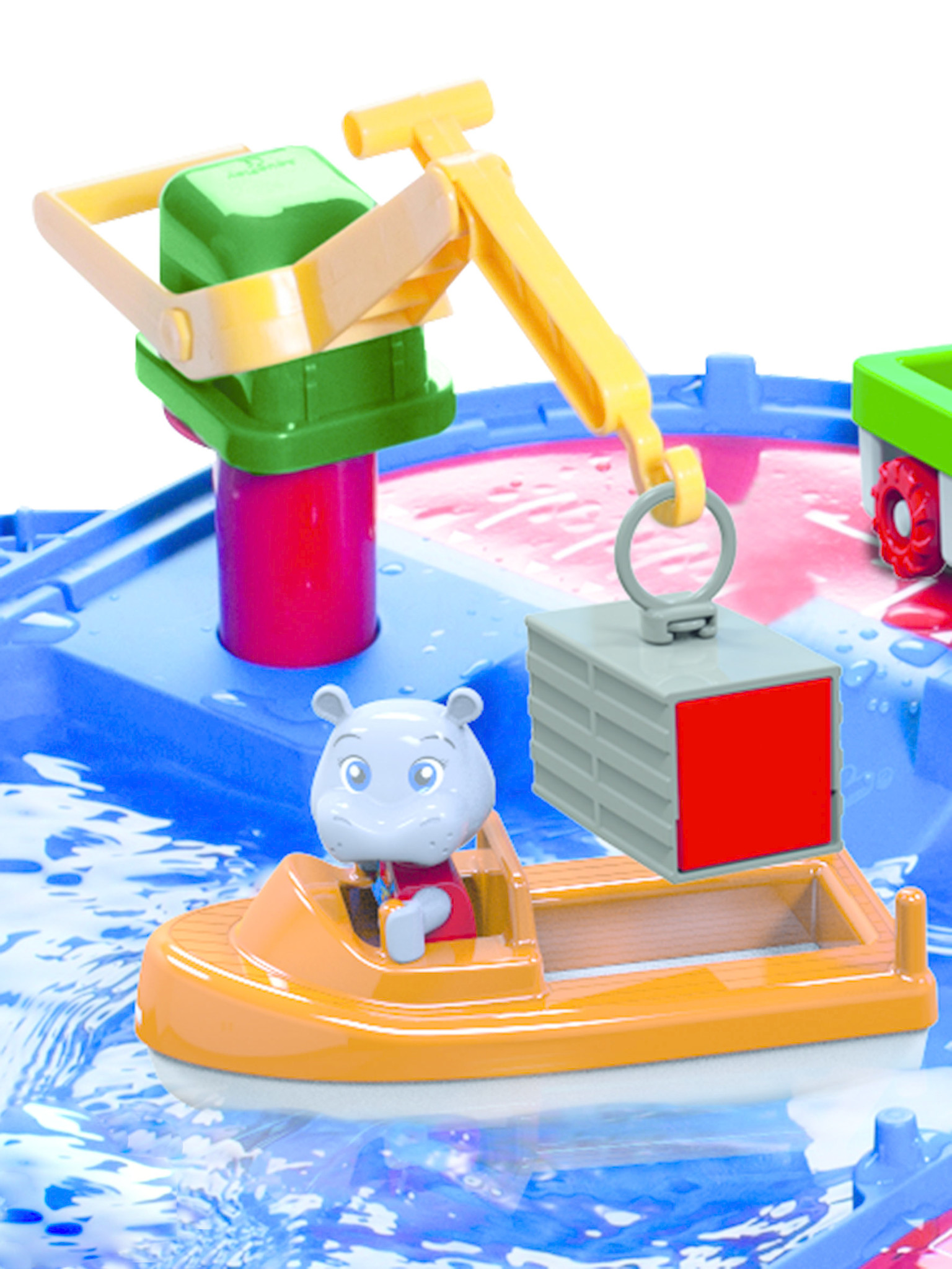 Maak kennis met Aquaplay’s bestseller, de draagbare sluizenbox! Laat Wilma het Nijlpaard het containerschip meenemen voor een tocht door het populaire sluissysteem met behulp van de pomp. In de haven zal de kraan u helpen om de container op de amfibietruc