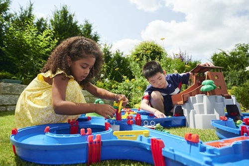 Dit koelwaterkanaalsysteem is enorm! Verzamel de kinderen en laat ze samen spelen met de accessoires hier om de verbeeldingskracht van kinderen te vervullen. De set bevat de hele Aquaplay-poppenfamilie; de beer, kapitein Bo, Wilma de nijlpaard, Lotta de eend en Nils de kikker. Laat Bo de voertuigen door de verschillende speelstations navigeren; Wilma zal de kraan gebruiken om de containerboot in de haven te lossen en Lotta zal laten zien hoe de veerboot bij het veerstation kan worden aangemeerd. De amfibieauto kan vanaf het land via een helling in het water rijden of de veerboot op. De voertuigen kunnen daarna hun reis vervolgen via het populaire sluitsysteem waar u het waterniveau regelt met behulp van de pomp en door de sluisdeuren te bewegen. Bij het draaien aan het scheprad wordt het water in beweging gezet, Aquaplay is een speelse manier om te leren hoe het water beweegt, lift en klimt. De Mega LockBox biedt ook de mogelijkheid om twee van de boxhelften los te koppelen om in elkaar te zetten – perfect als je Aquaplay mee wilt nemen op vakantie of naar vrienden!