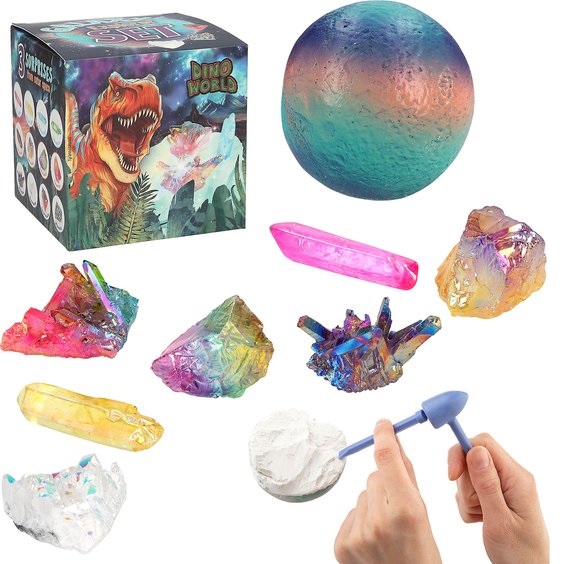 Galaxy cool: in de gekleurde bol zitten 3 verschillende edelstenen verstopt die elk hun eigen kracht hebben (in totaal zijn er 12 soorten edelstenen). Met het bijgesloten kunststof gereedschap (hamer, beitel, kwast) kunnen de glimmende schatten uitgegrave